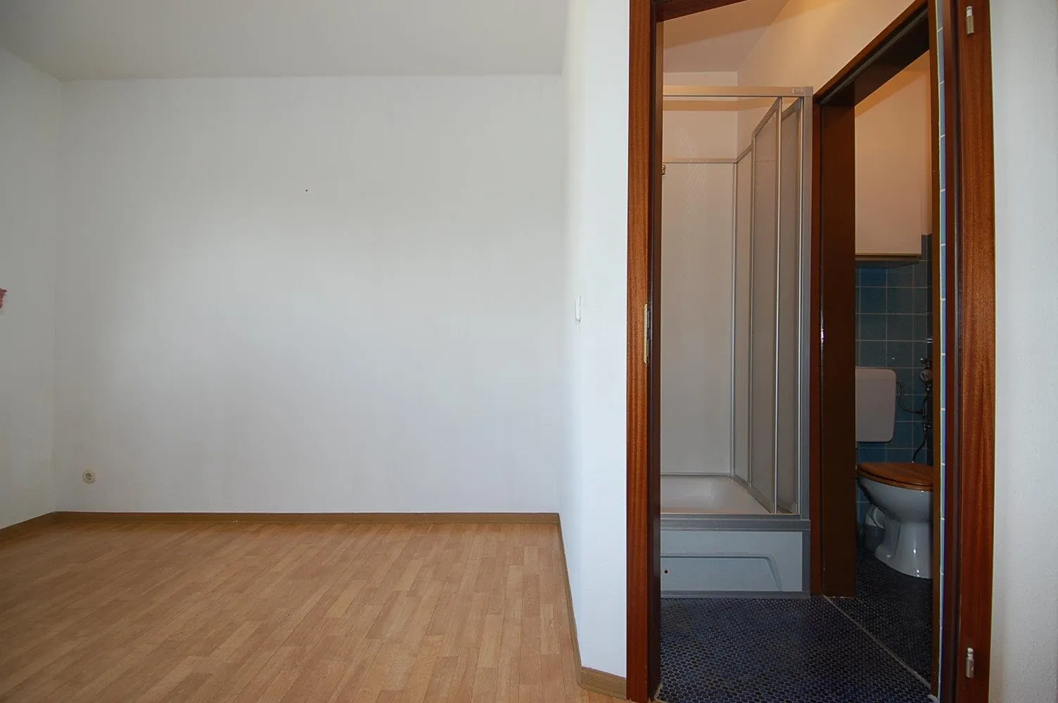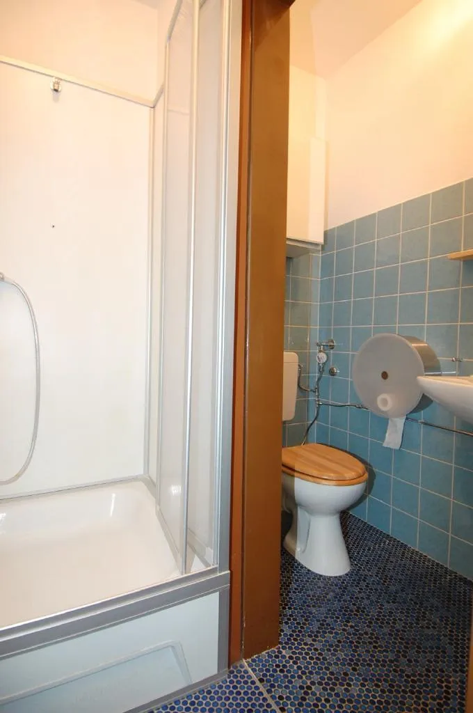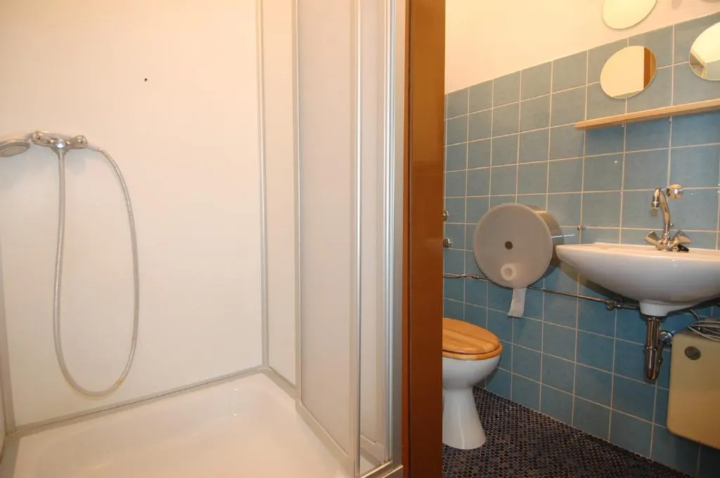 Das Bad ist halbhoch gefliest und hat eine Dusche und ein WC.