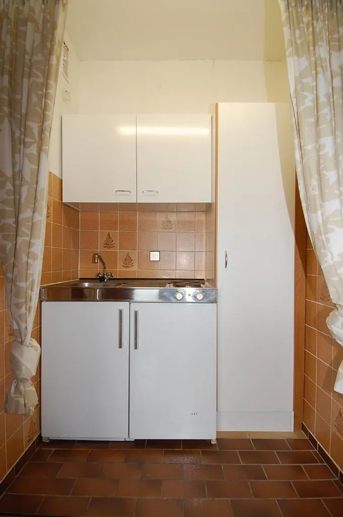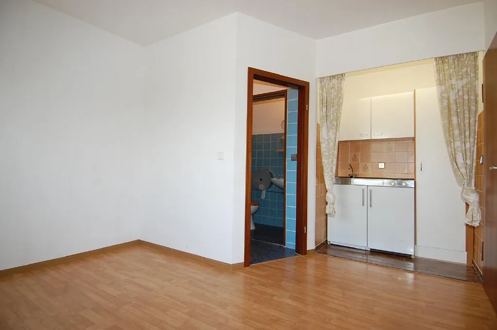 Die Wohnung hat einen Wohn-/Schlafraum, der mit PVC ausgelegt ist und ein großes Kunststofffenster mit Rollladen mit Fernsicht. An dieses Zimmer grenzen die geflieste, offene Küche mit einer Küchenzeile (Spüle, Kühlschrank mit Gefrierfach, Ober- und Unterschränke, Herd mit 2 Kochplatten) und das Bad.
