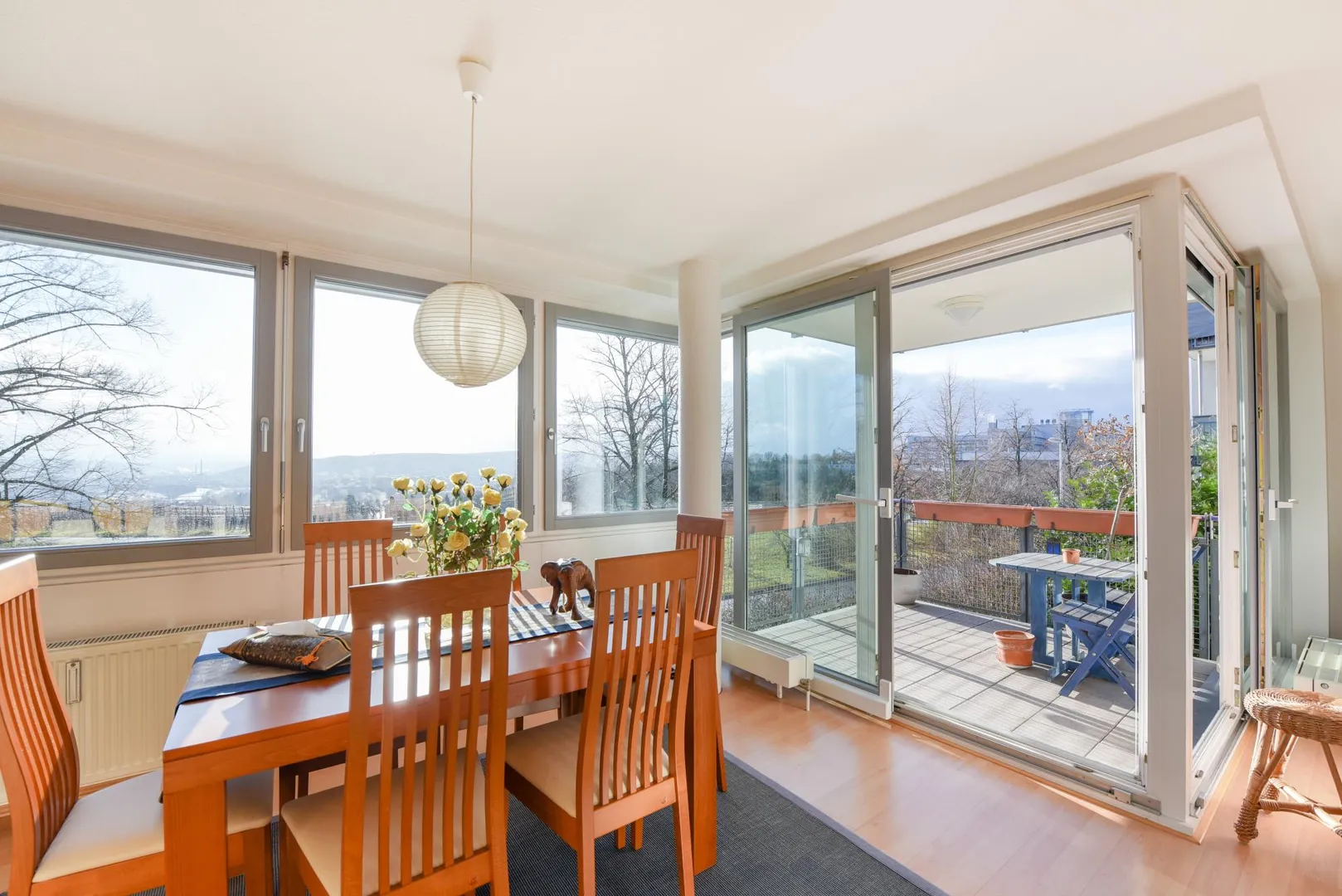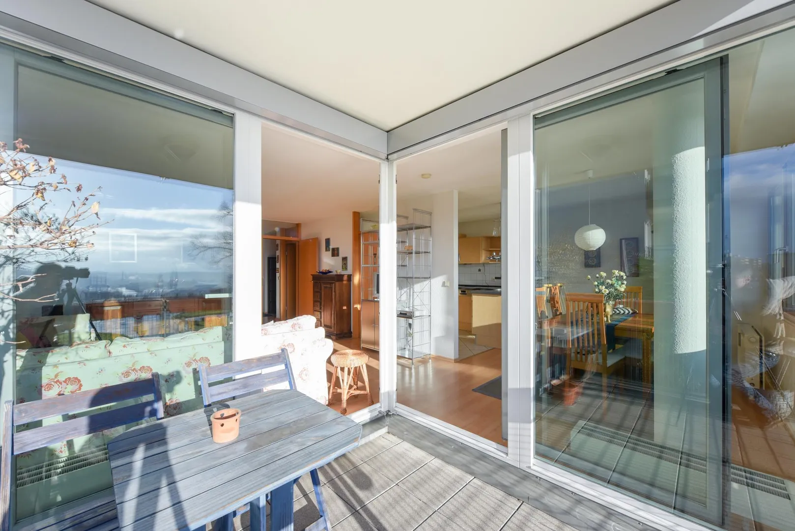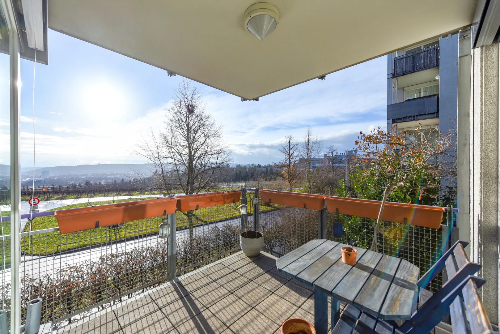 Der ca. 6,8 m² große und überdachte Balkon ist über zwei Schiebetüren von Wohnzimmer begehbar.