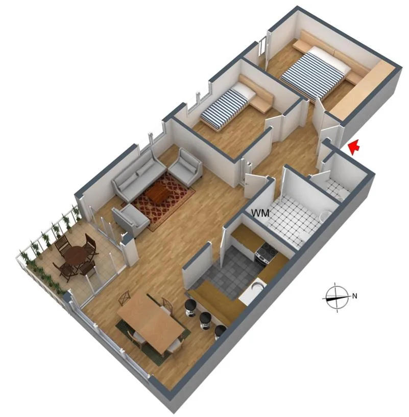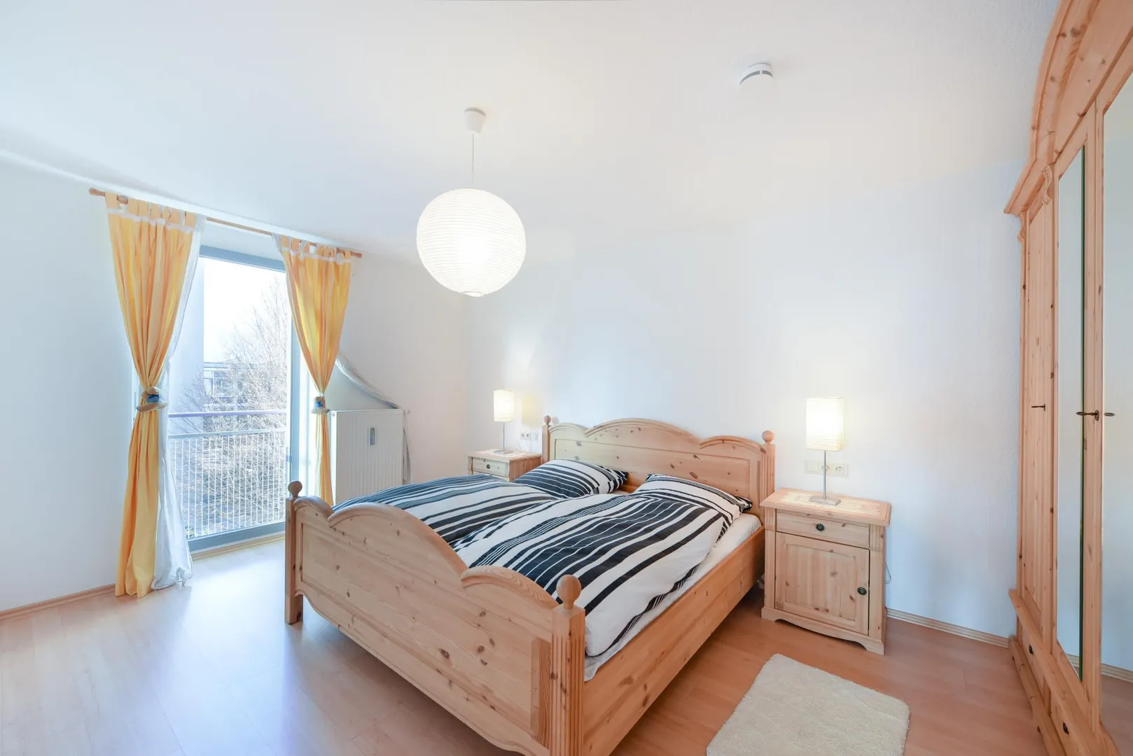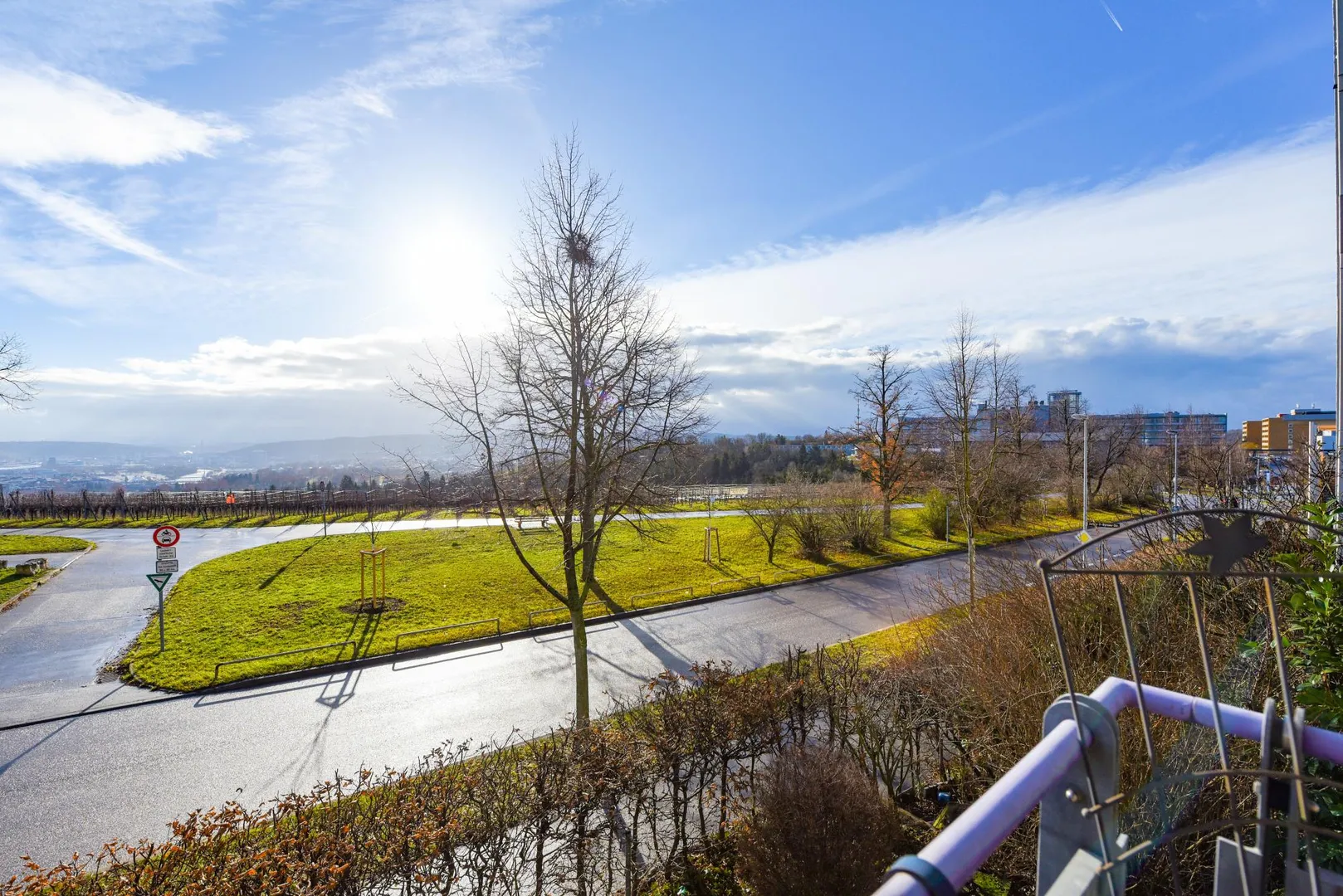 Der ca. 6,8 m² große und überdachte Balkon ist über zwei Schiebetüren von Wohnzimmer begehbar.