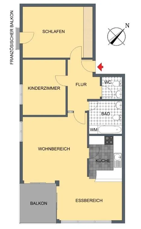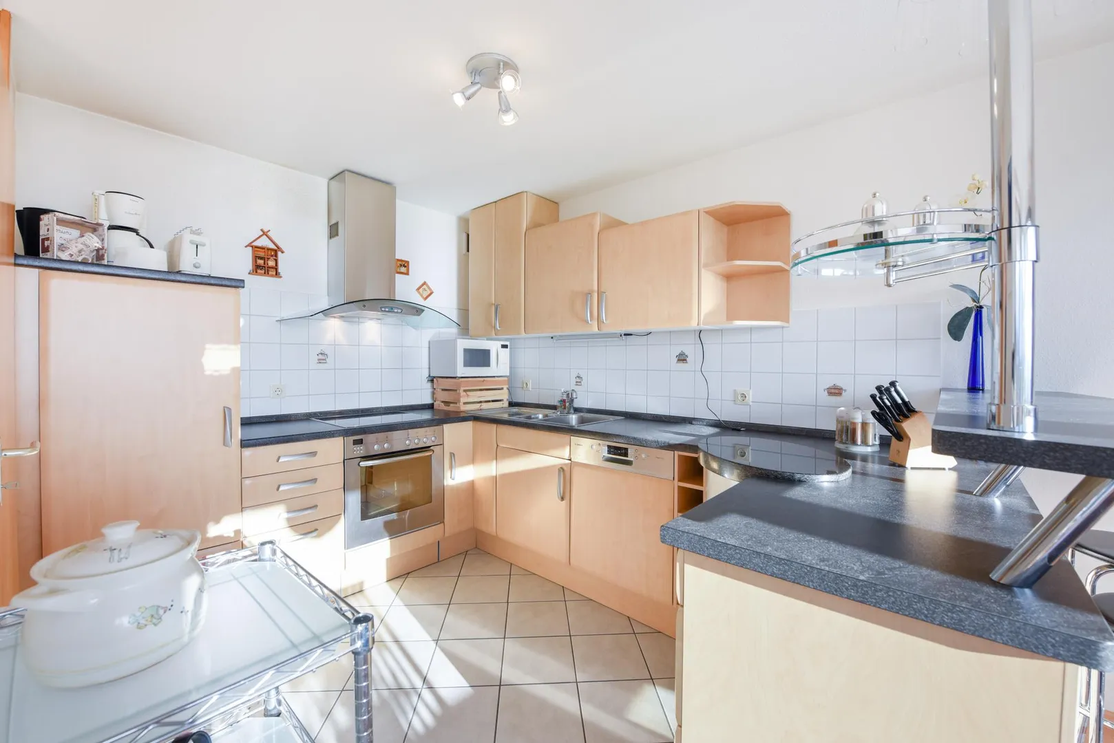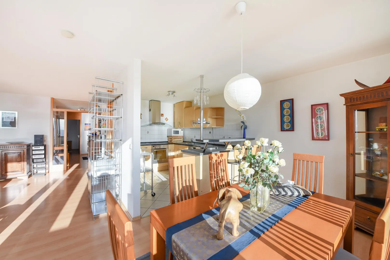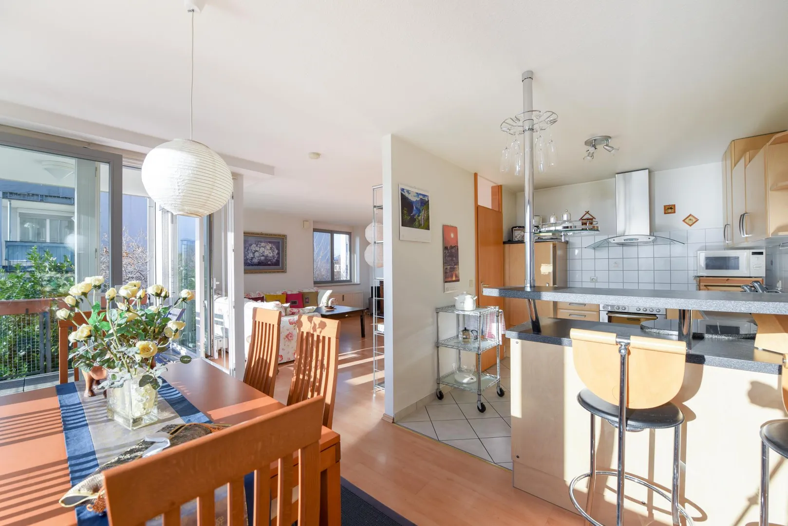 Die Küche ist zum Essbereich offen und mit einer Theke von diesem getrennt. Das Wohn-/Esszimmer, die offene Küche sowie der Balkon sind nach Süd-Osten ausgerichtet.