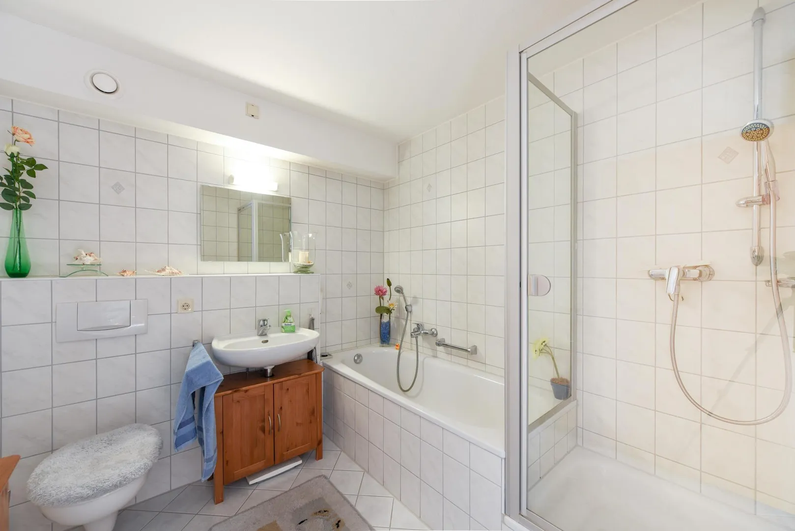Das raumhoch geflieste Badezimmer ist ausgestattet mit einer Badewanne, einer Dusche, einem WC sowie einem Handtuch-Heizkörper. Das zweite, geflieste WC ist separat.