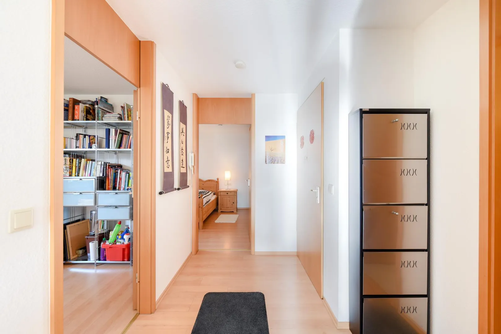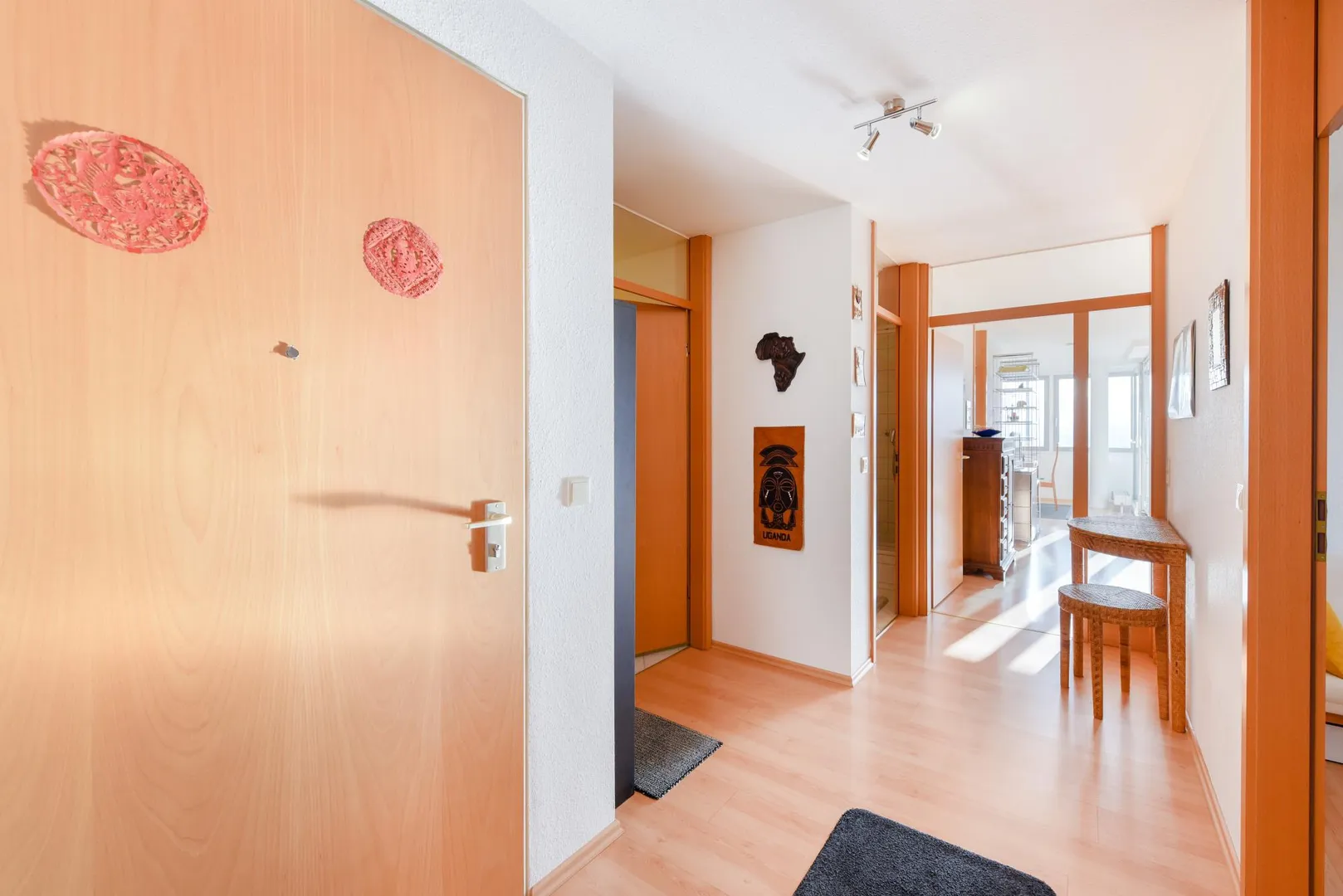 Die Böden im Flur sowie in den Zimmern sind mit Laminat ausgestattet. Die Böden im Badezimmer, im WC und in der Küche sind gefliest.