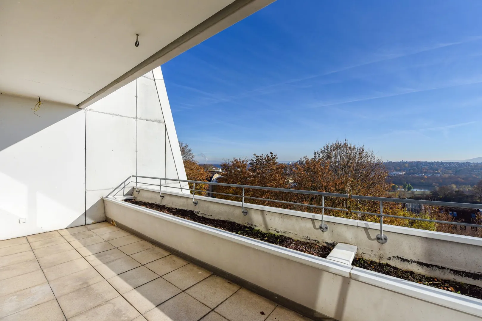 Der Süd/Ost-Balkon mit Fernsicht ist teilweise überdacht. Beide Balkone sind mit einem Pflanzenbeet ausgestattet.