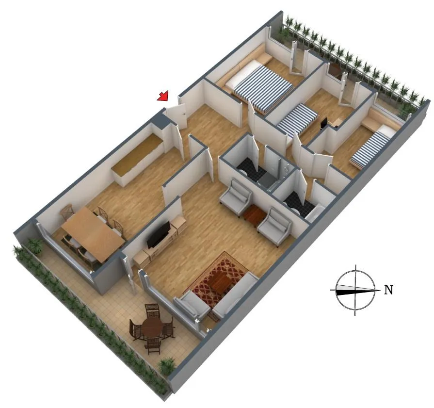 Das Wohnzimmer mit Balkon sowie der Essbereich mit Küche sind nach Süd-Osten ausgerichtet. Das Schlafzimmer und die beiden Kinderzimmer sind nach Nord-Westen ausgerichtet. Die beiden Bäder sind innenliegend.