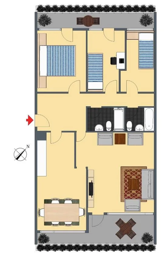 Der Grundriss ist gut: alle Räume sind direkt vom Flur begehbar. Die Wohnung verfügt über 2 Bäder mit jeweils einem WC. In der Wohnung gibt es einen Abstellraum. Vom Wohnzimmer ist der Süd/Ost-Balkon begehbar. Vom Schlafzimmer und Kinderzimmer ist der Nord/West-Balkon begehbar.