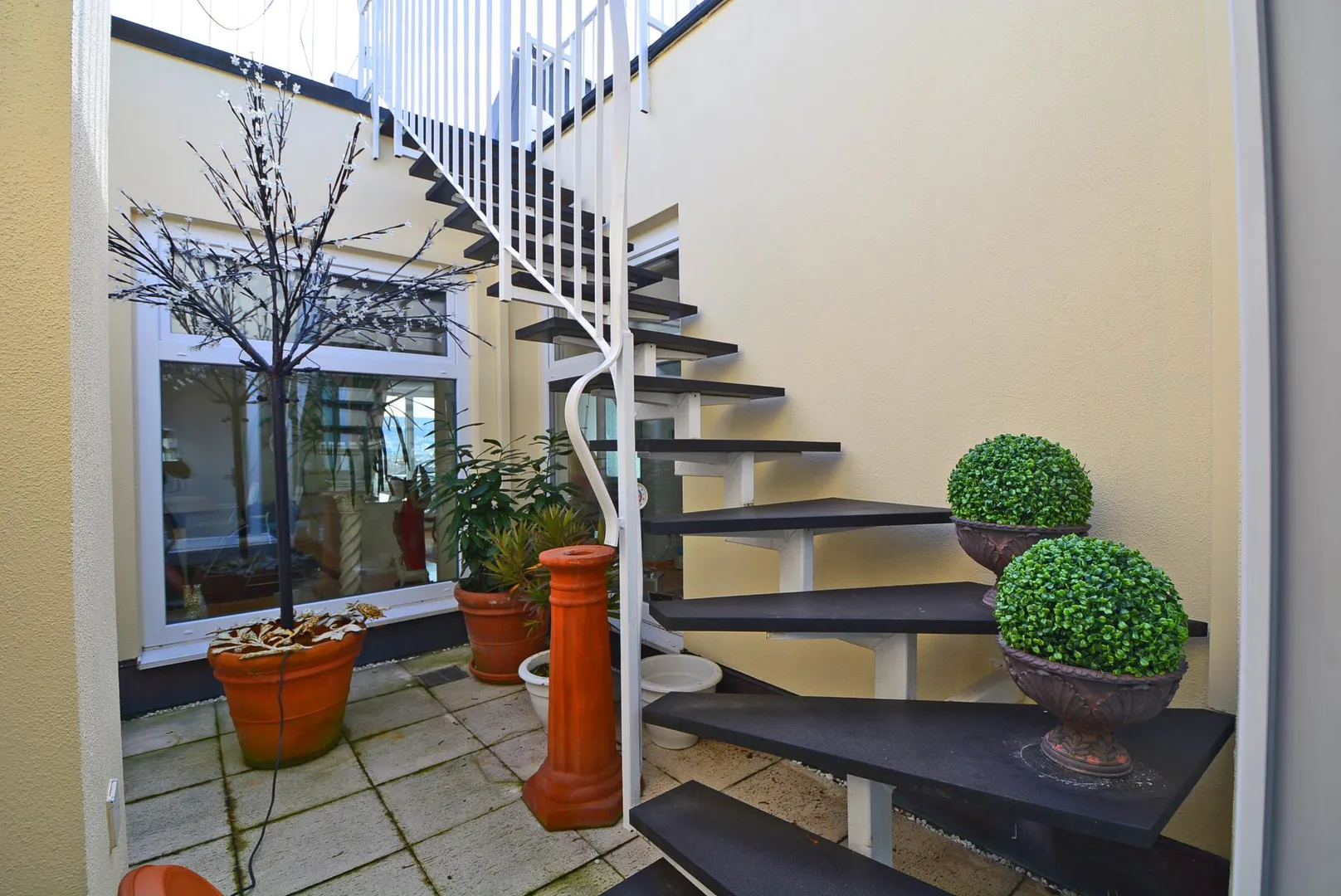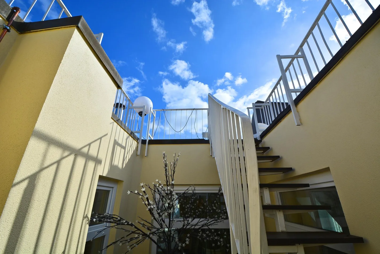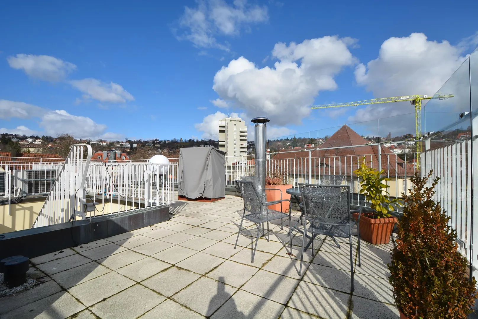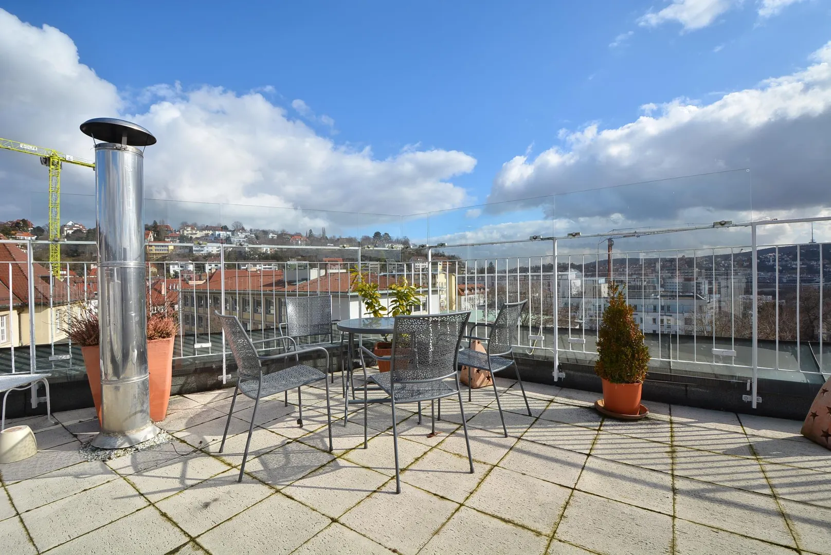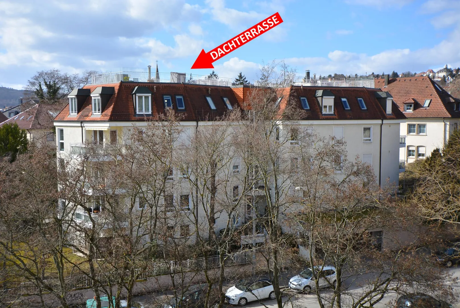 Die ca. 50 m² große Dachterrasse befindet sich auf dem Flachdach des Hauses und ist über eine Treppe begehbar. Die Treppe ist im Lichthof, welcher im Zentrum der Wohnung gelegen ist. Von der Terrasse gibt es einen 360°-Panoramablick über die Stadt Stuttgart.