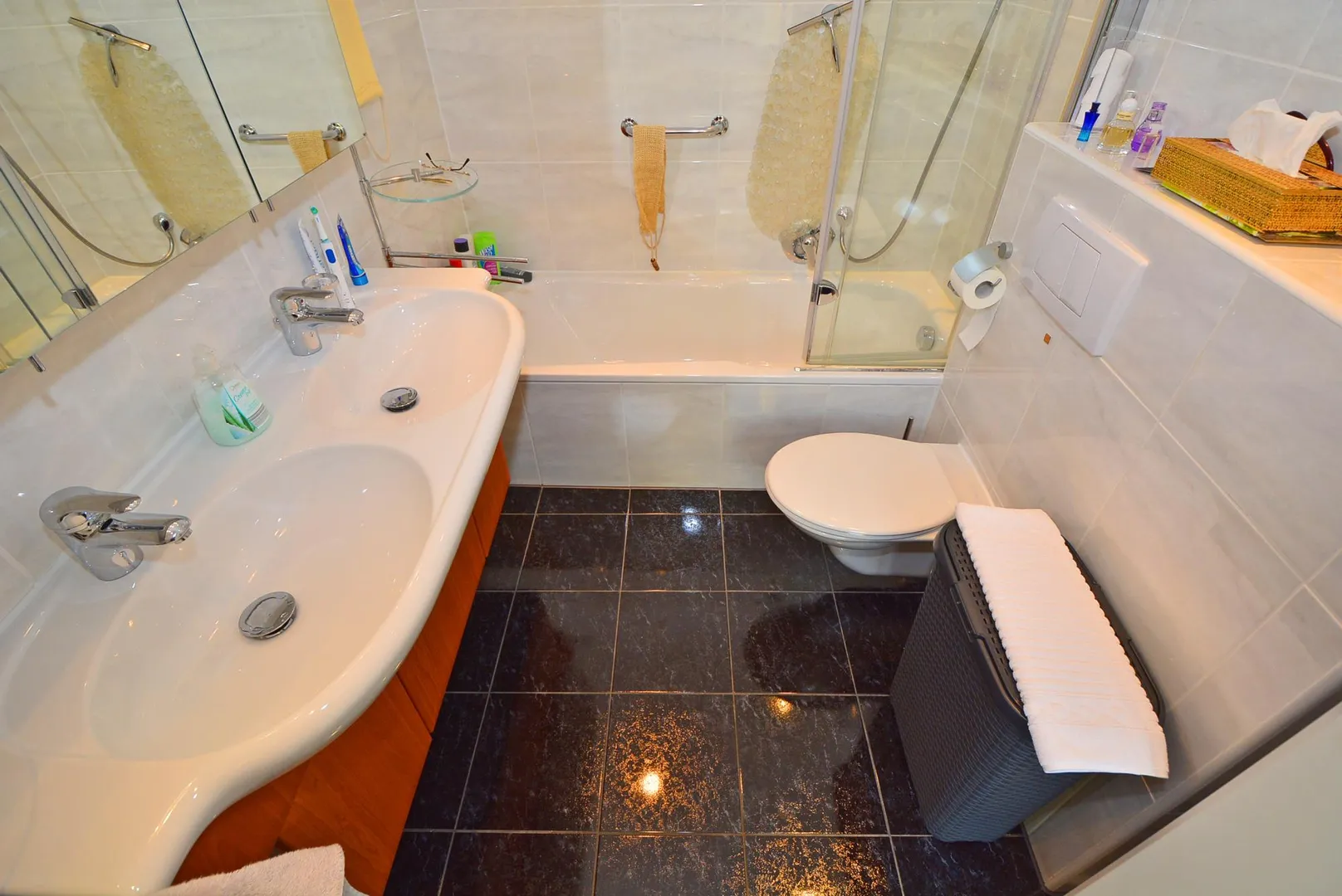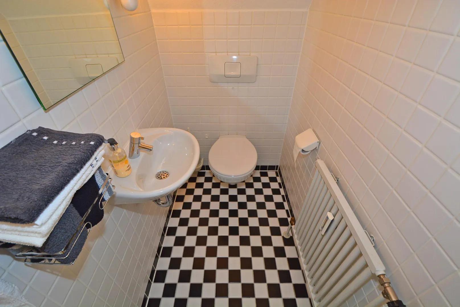 Alle Räume sind von der Diele begehbar. Das ¾-hoch geflieste Badezimmer ist ausgestattet mit Fußbodenheizung, einer Badewanne mit Duschwand, einem WC, einem Doppelwaschbecken sowie einem Spiegelschrank und einem Waschtisch-Unterschrank. Ein zweites, gefliestes WC ist separat.