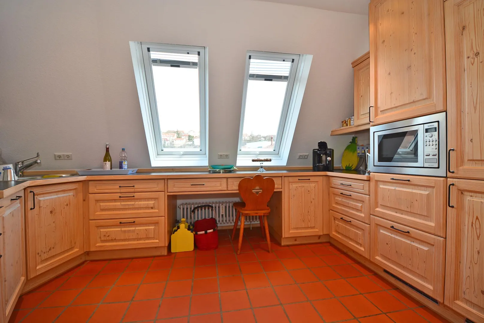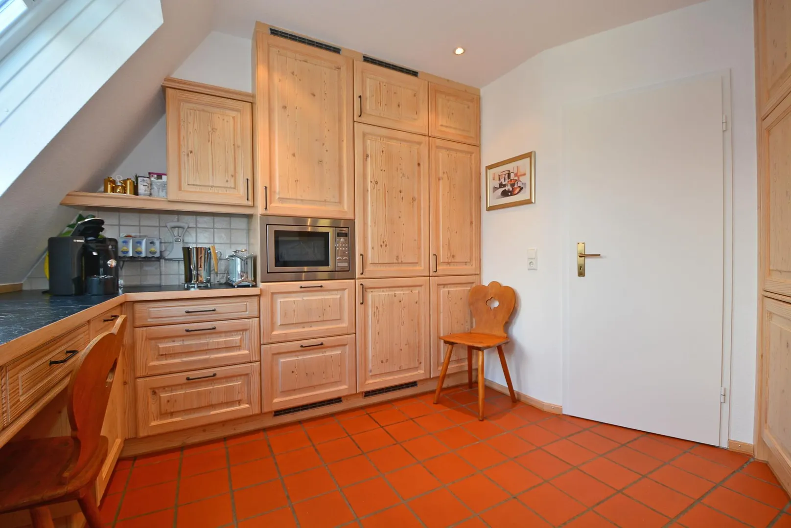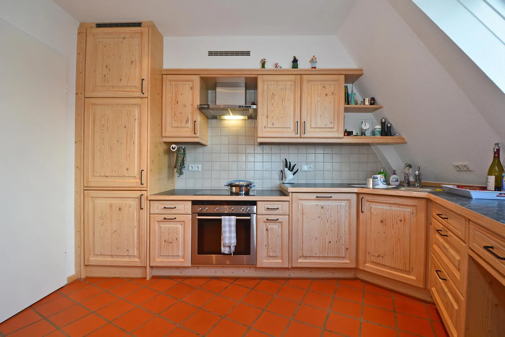Die Küche verfügt über einen terrakottafarbenen Fliesenboden sowie eine hochwertige Einbauküche im Landhausstil. Die Einbauküche ist ausgestattet mit einem Kühlschrank, einem Gefrierschrank, einer Spülmaschine, einem Cerankochfeld, einem Backofen, einer Dunstabzugshaube (Umluft), einer Mikrowelle, einer Spüle, einer Waschmaschine, einem Trockner sowie Ober- und Unterschränken.