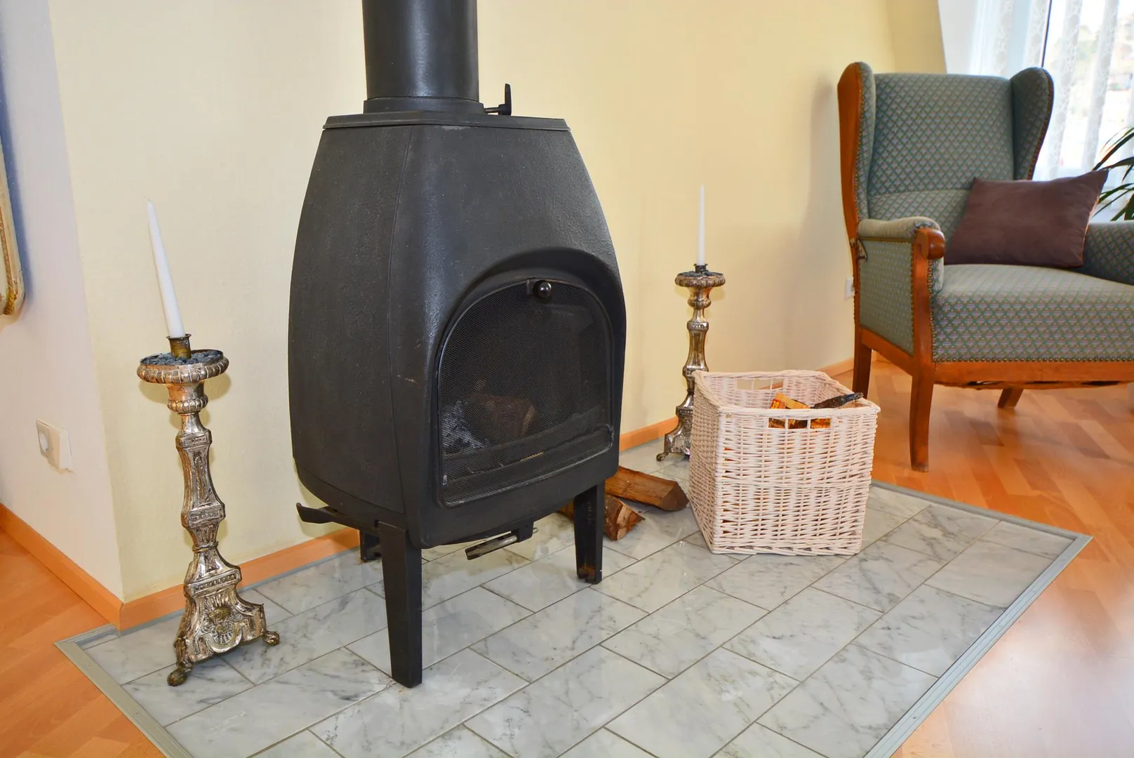 Im Wohn-/Essbereich befinden sich ein Schwedenofen für die kalte Jahreszeit sowie ein Klima-Splitgerät für die warme Jahreszeit.