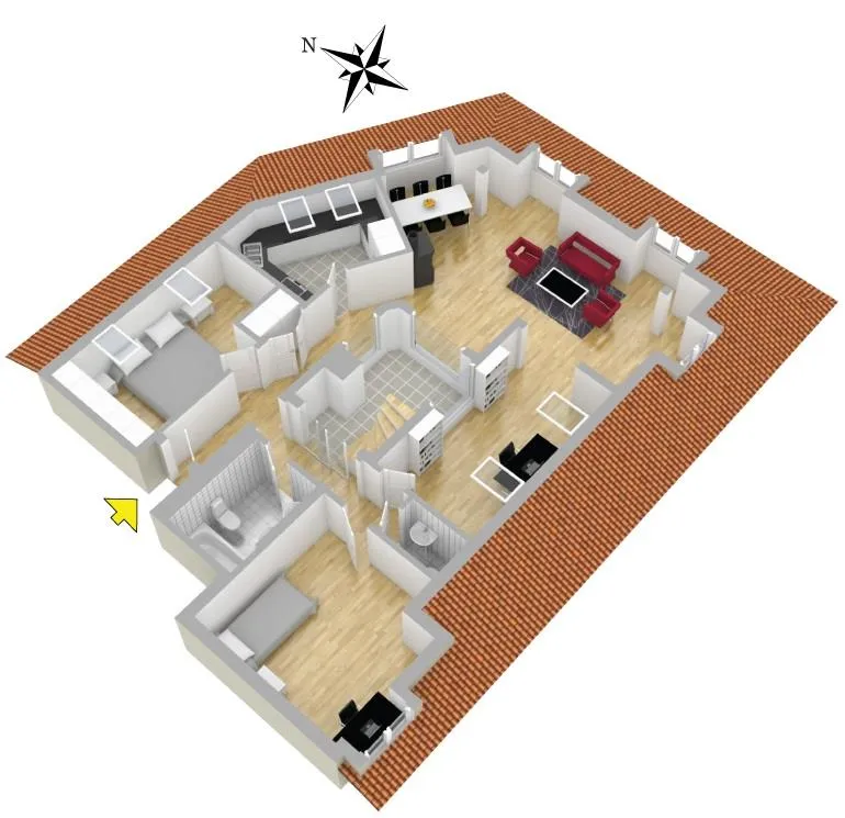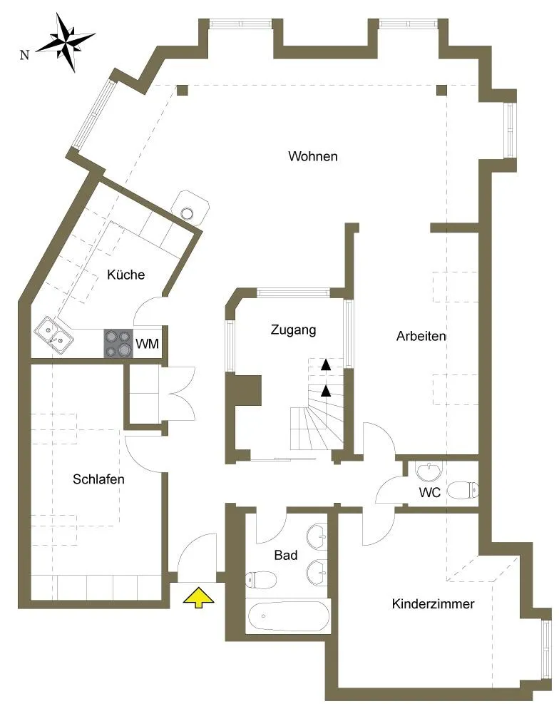 Die Wohnung ist sehr hell. Das Schlafzimmer und die Küche sind nach Norden ausgerichtet; der Wohn-/Essbereich nach Osten und Süden; das Arbeits- sowie das Kinderzimmer nach Südwesten.
