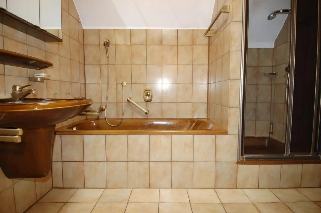 Das ursprüngliche Badzimmer mit einem Oberlicht-Fenster ist raumhoch gefliest. Es ist ausgestattet mit einem Fliesenboden, einer Wanne, einer Dusche sowie einem Waschmaschinenanschluss. Direkt neben dem Badezimmer befindet sich das separate, geflieste WC.