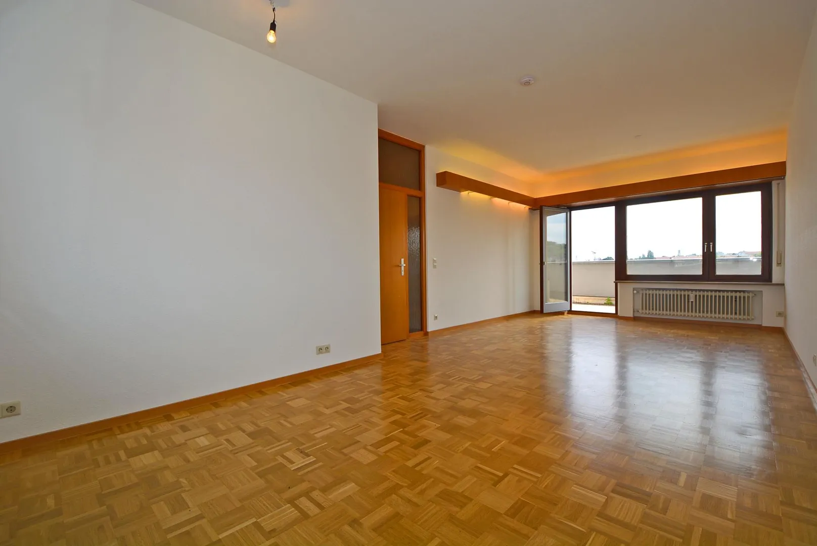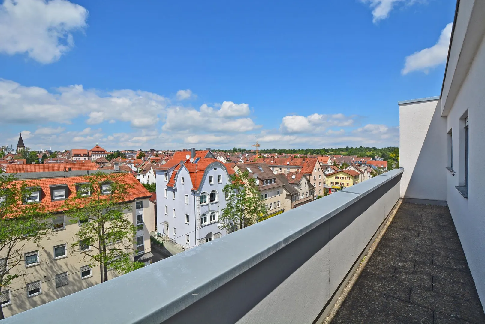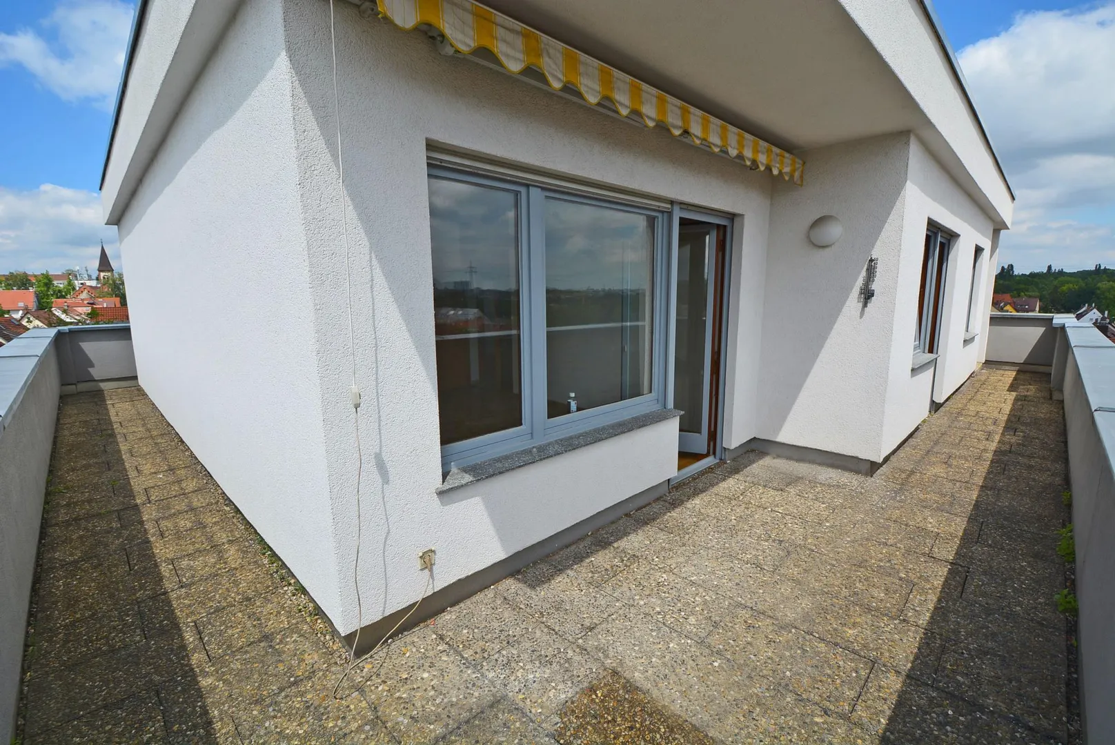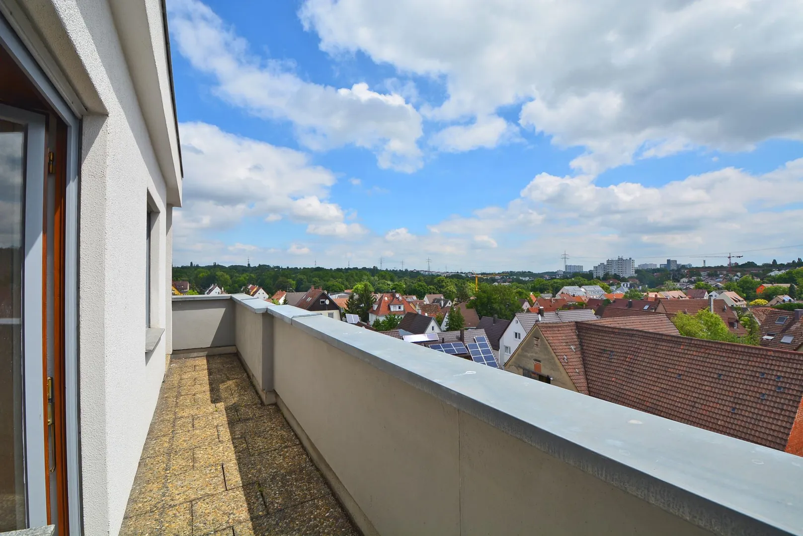 Die ca. 40 m² große, umlaufende Dach-Terrasse mit Fernblick bis zum Fernsehturm ist mit einer Markise ausgestattet und vom Wohnzimmer sowie vom Schlafzimmer begehbar.