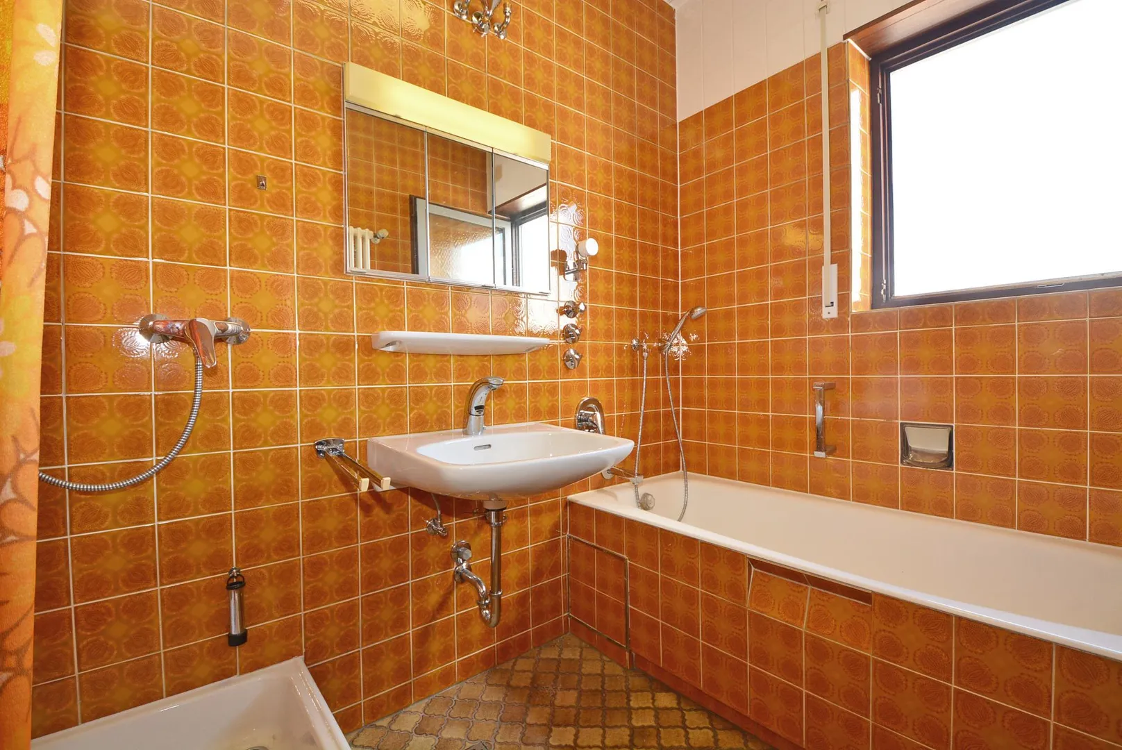 Das ältere Tageslicht-Badezimmer ist raumhoch gefliest und mit einer Badewanne, einer Dusche sowie mit Fliesenboden ausgestattet.