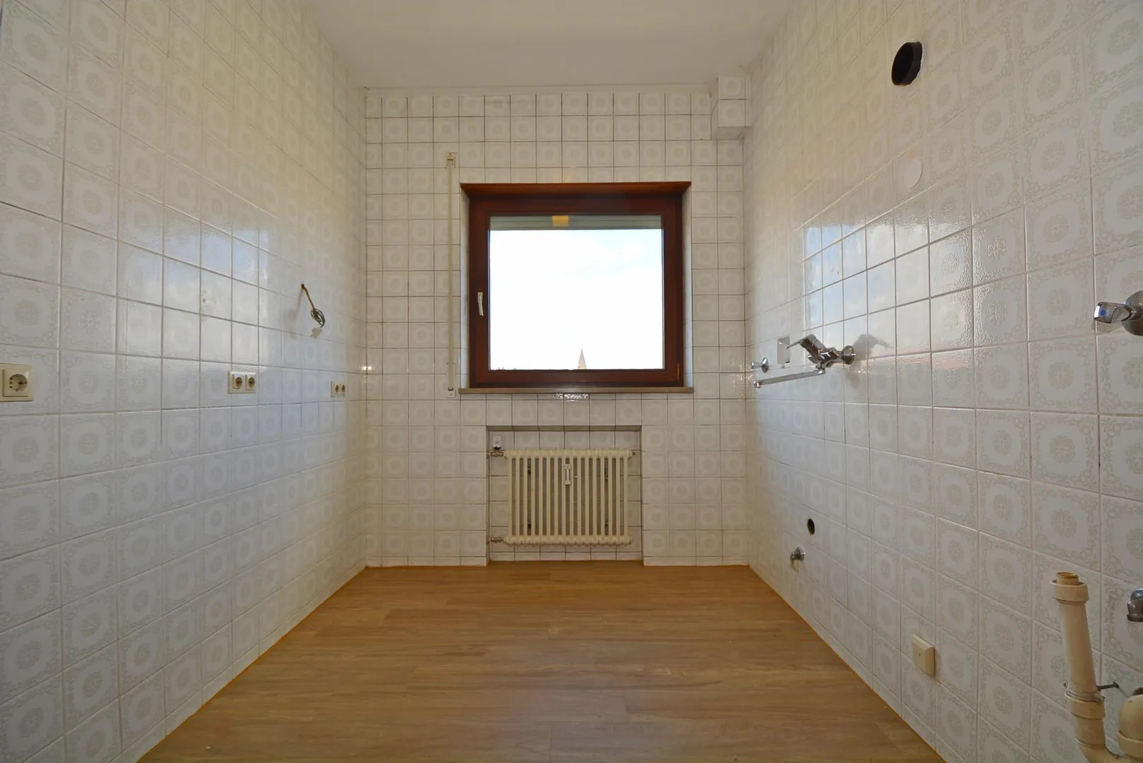 Der Waschmaschinenanschluss befindet sich in der Küche. Die Wände sind in der Küche gefliest. Eine Einbauküche ist nicht vorhanden.