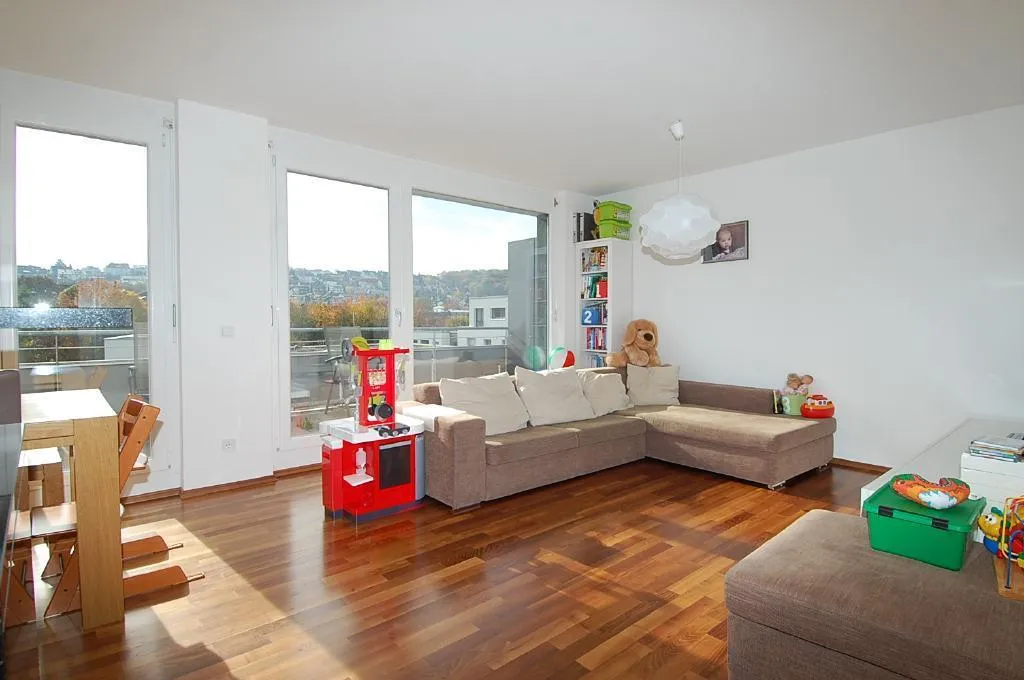 Die Wohnung ist durch die Süd Ausrichtung und die breite Fenster-Front im Wohn-Esszimmer mit offener Küche sehr hell und sonnig.