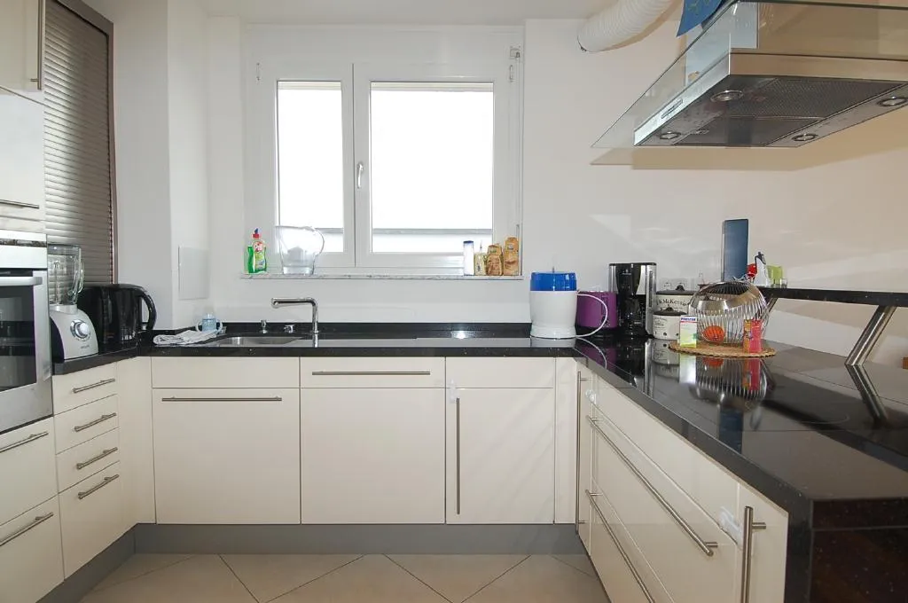 Der Boden in der offenen Küche ist gefliest. Die Küche ist mit einer neu- und hochwertigen Einbauküche und mit einem Außen-Abzug ausgestattet.