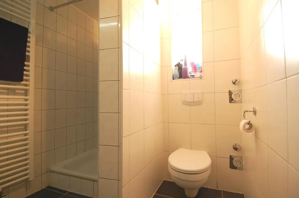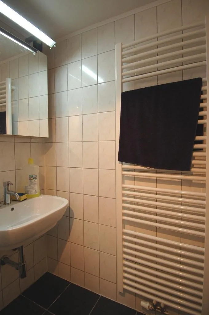 - Bad mit Dusche, Waschbecken, Handtuch-Heizkörper, WC und Fenster