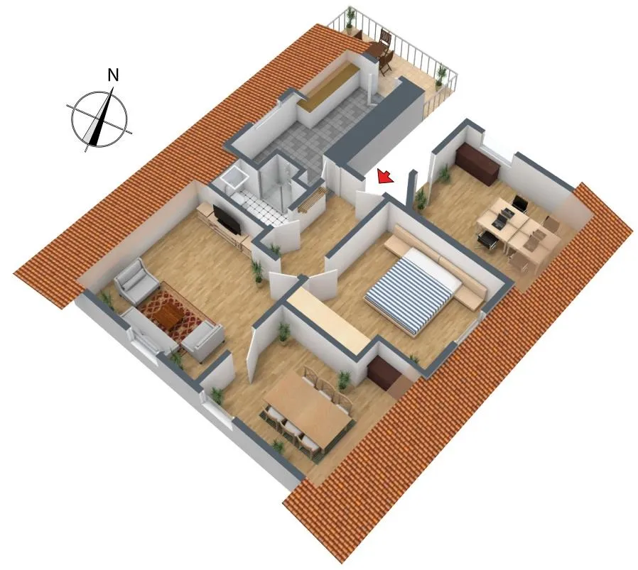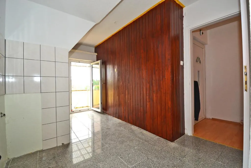 Der Grundriss ist einfach. Das Esszimmer ist über das Wohnzimmer begehbar. Der ca. 5 m² große und überdachte Nord-Balkon ist über die Küche begehbar. Das kleine, ca. 2 m² große Tageslicht-Badezimmer ist halbhoch gefliest und ist ausgestattet mit einer Dusche, einem neuen Waschbecken, einem WC sowie einem Handtuchheizkörper.