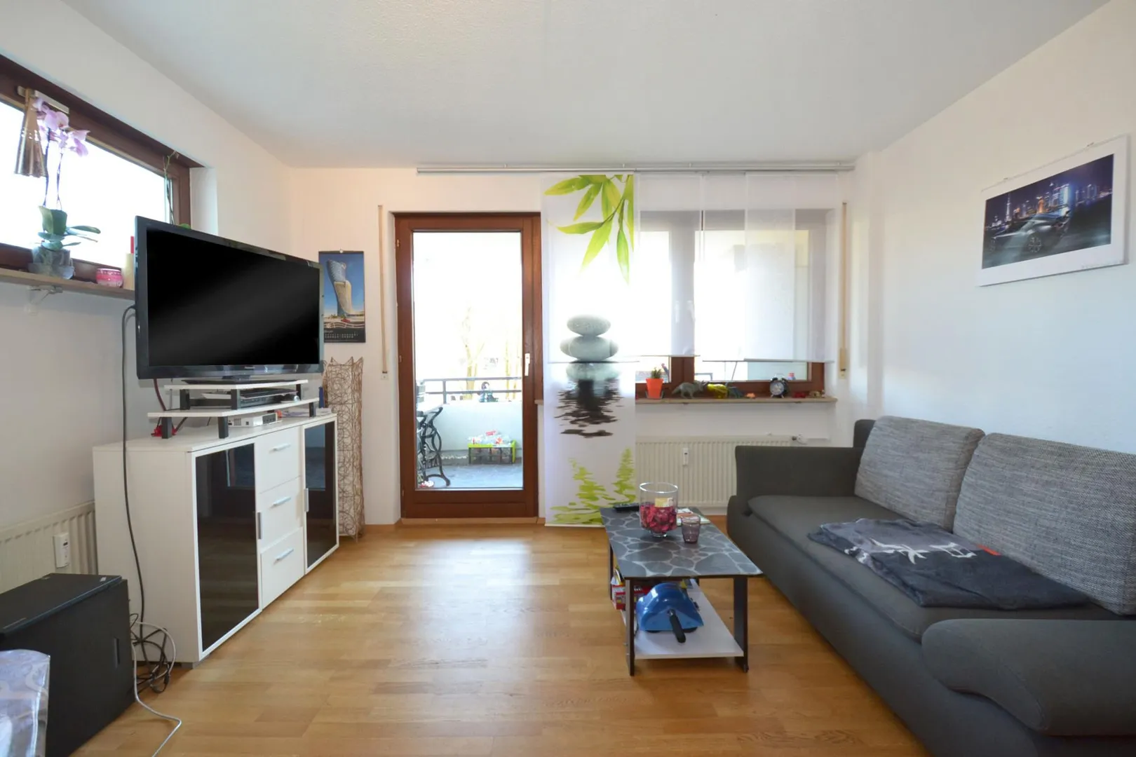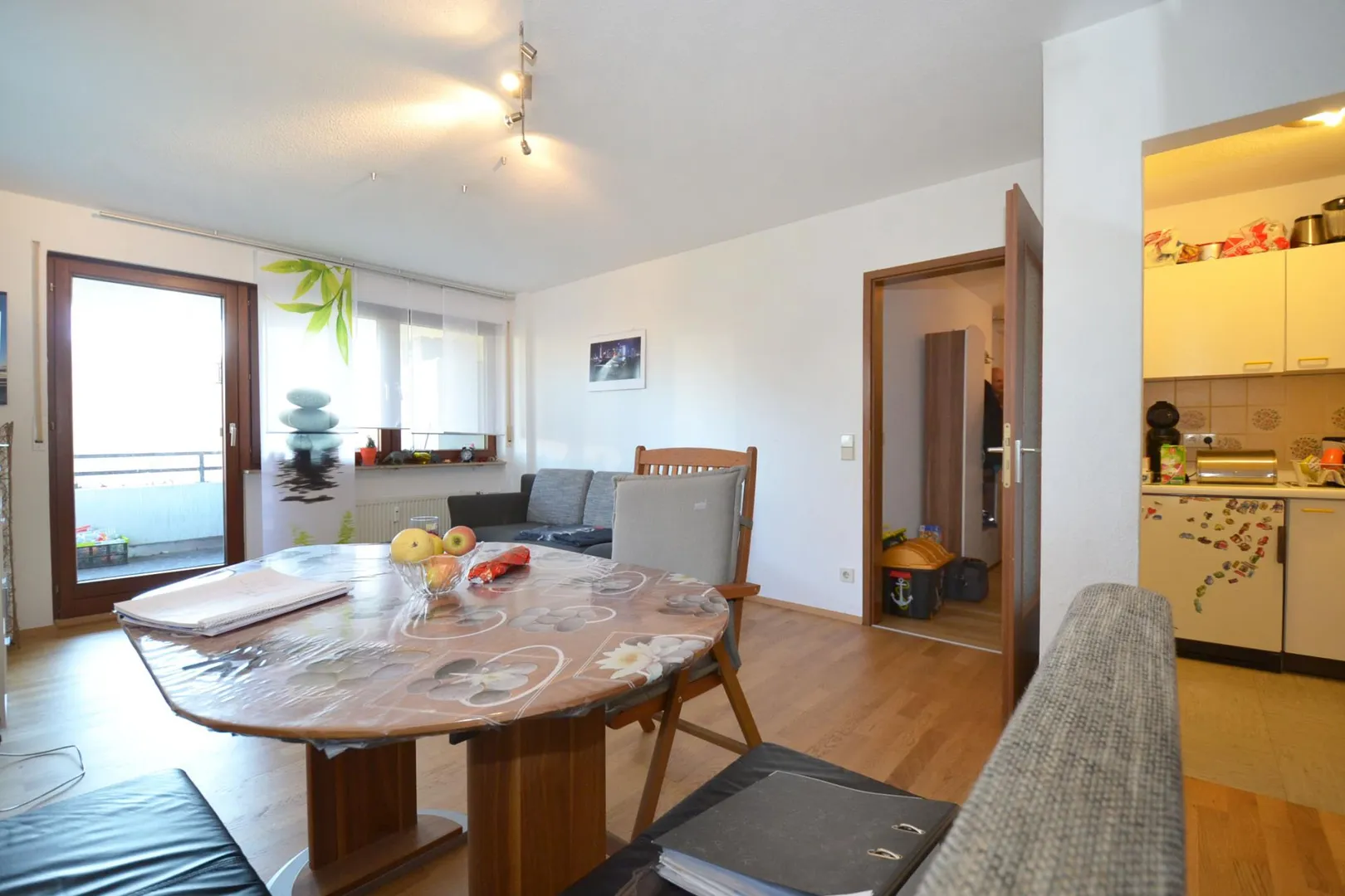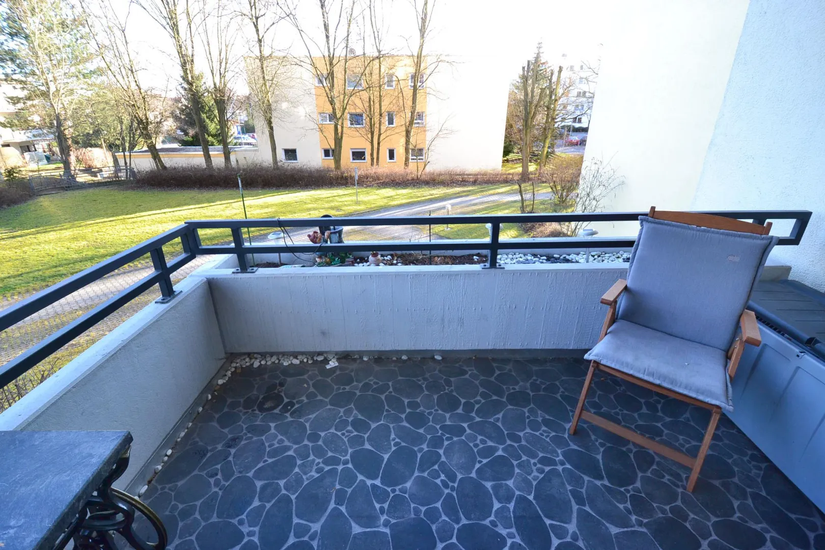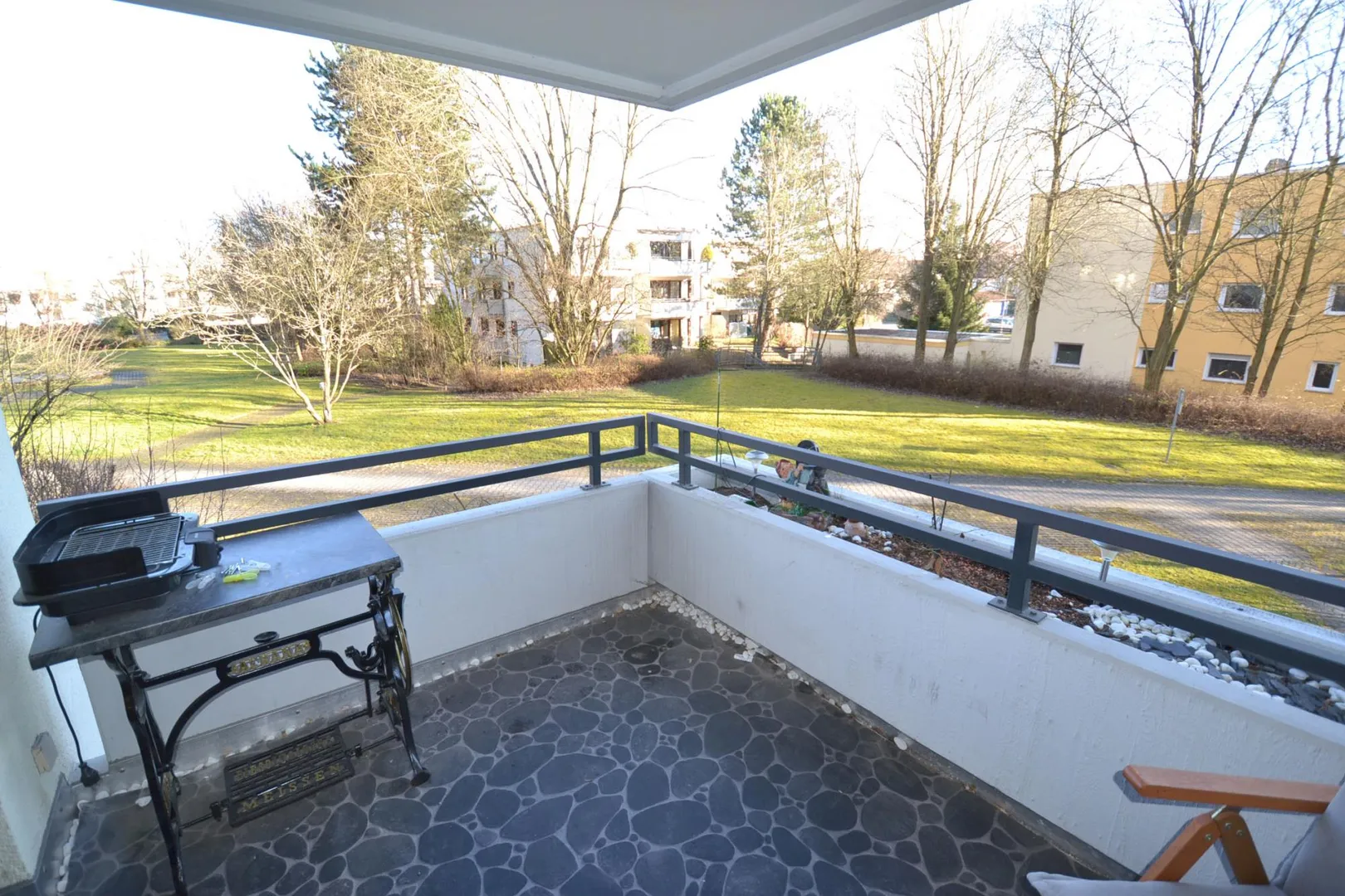 Von hier aus gelangen Sie auf den relativ großen, überdachten und nach Süd/Ost ausgerichteten Balkon.