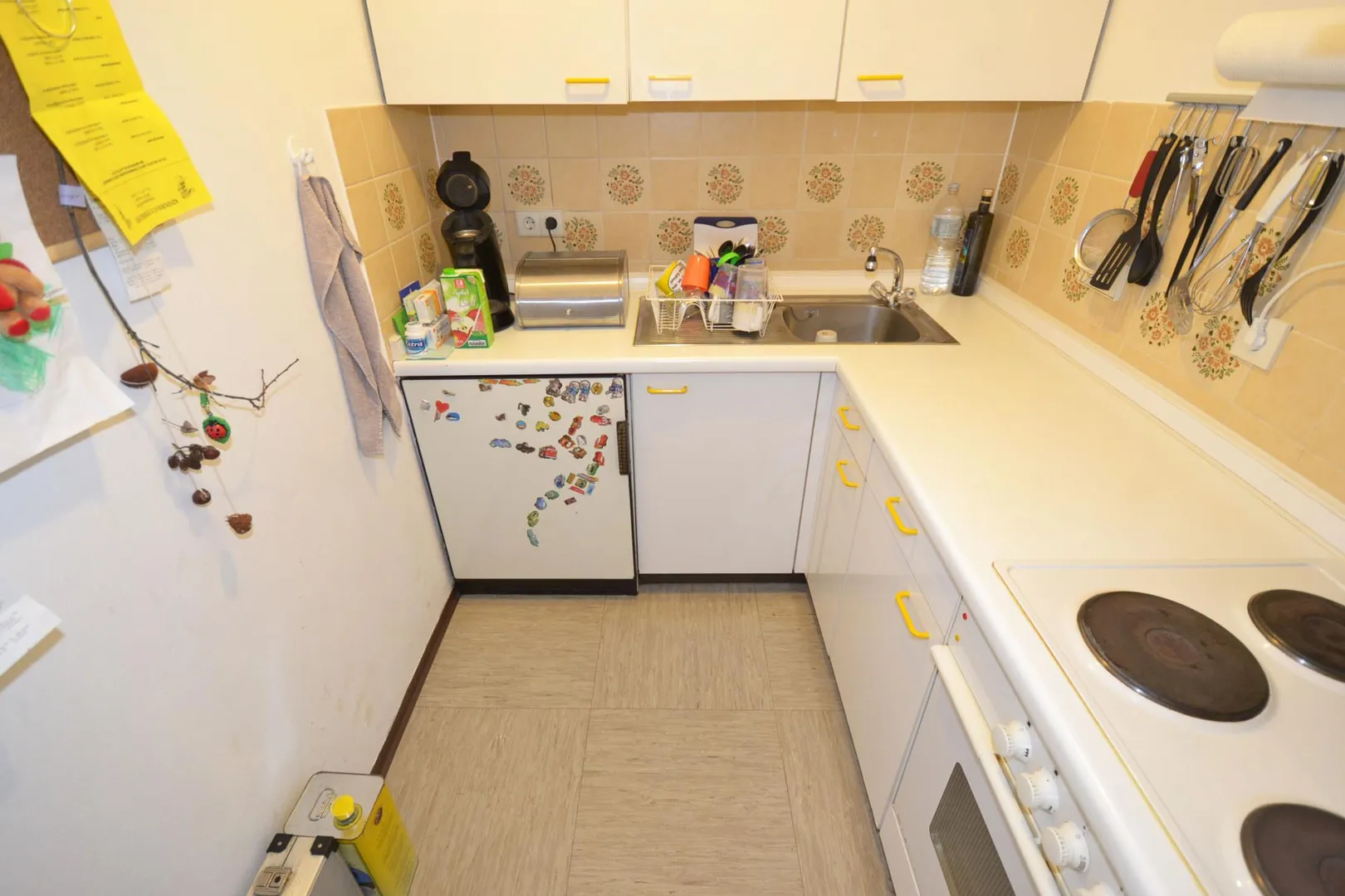 Sie verfügt über eine gebrauchte und gepflegte Einbauküche: diese ist ausgestattet mit E-Kochfeld und Backofen, Kühl-/Gefrierschrank, Abluft-Dunstabzug sowie Stauraum in Ober- und Unterschränken.