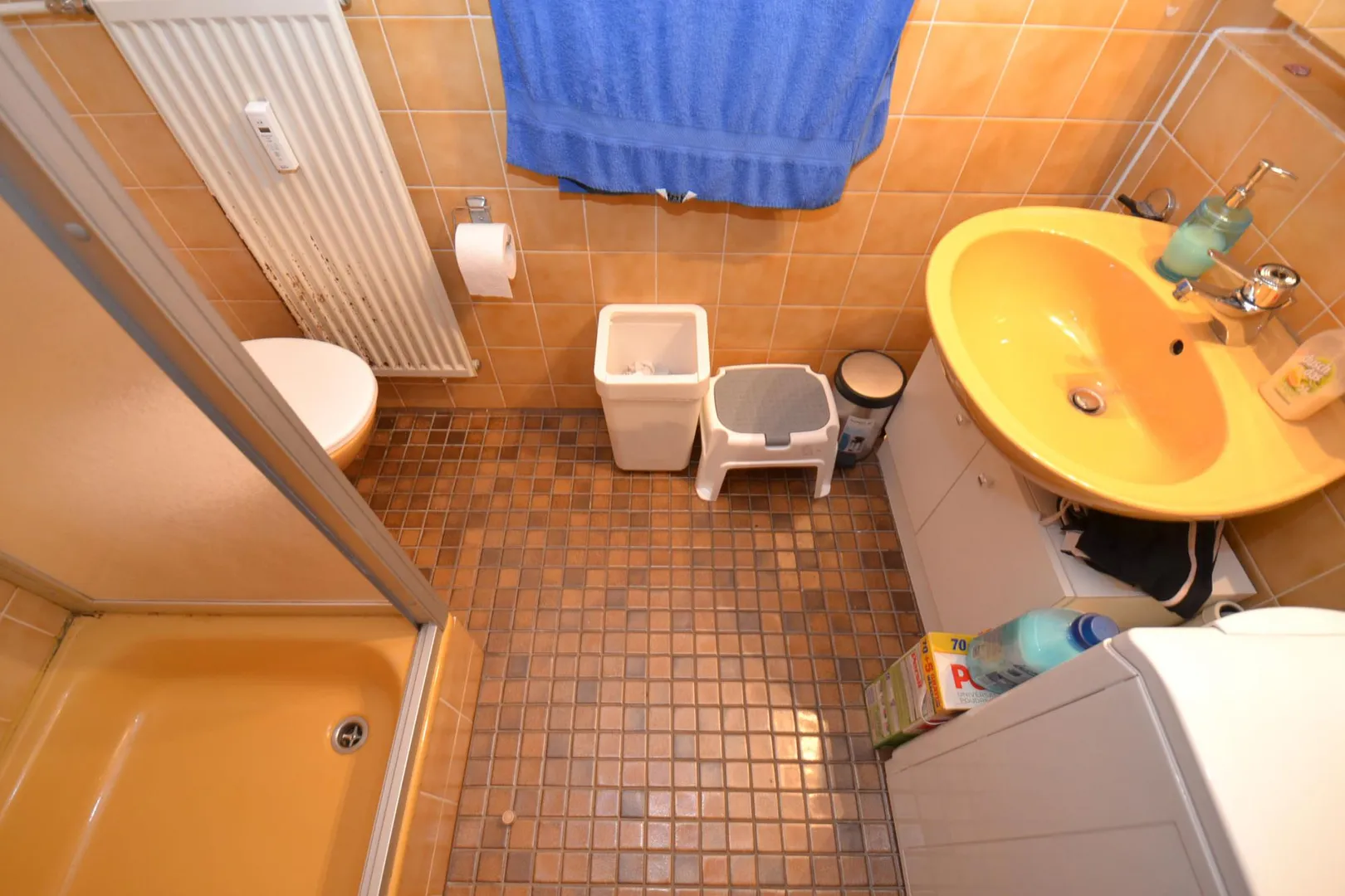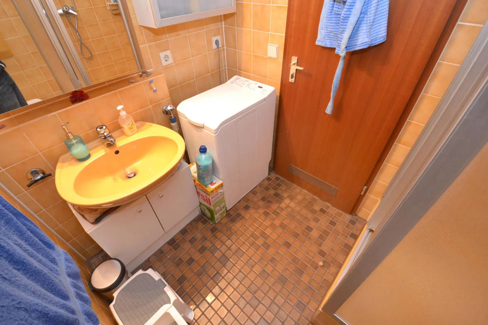 Das Bad ist raumhoch hellbraun gefliest und mit Dusche, Waschbecken und WC ausgestattet. Hier befindet sich auch ein Waschmaschinenanschluss (für schmale Modelle).