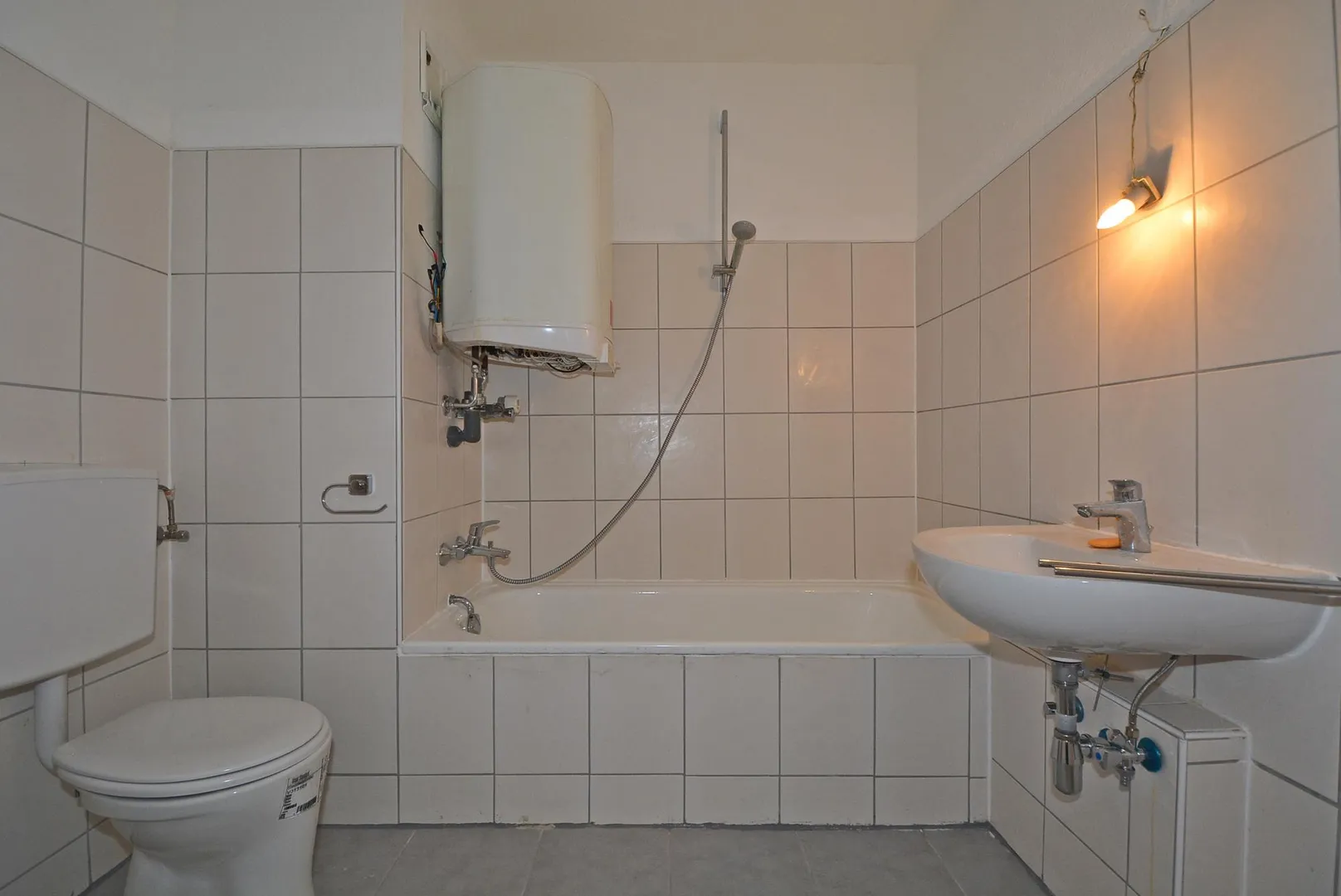 - Bad: Wandfliesen, Armaturen, Waschbecken und WC