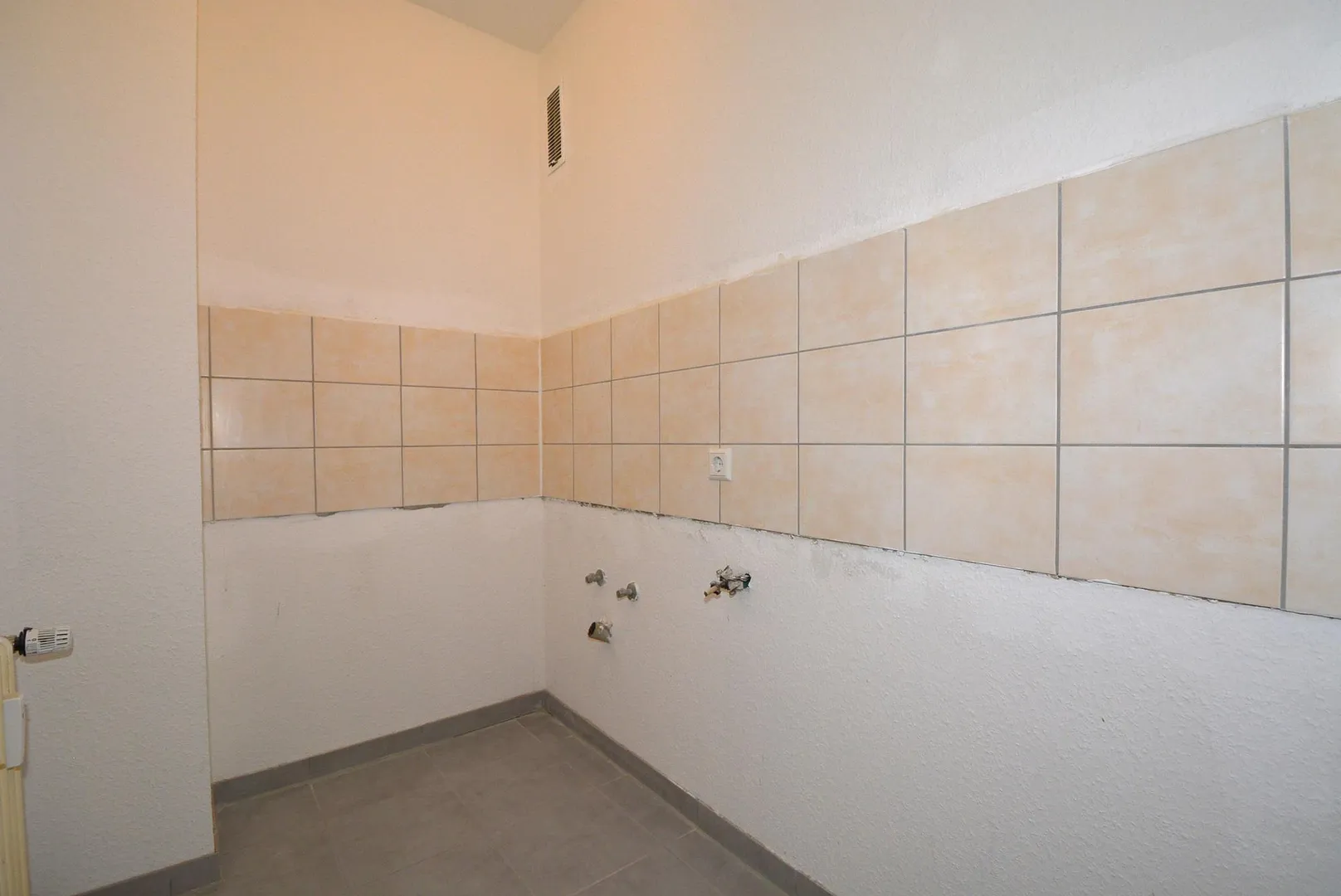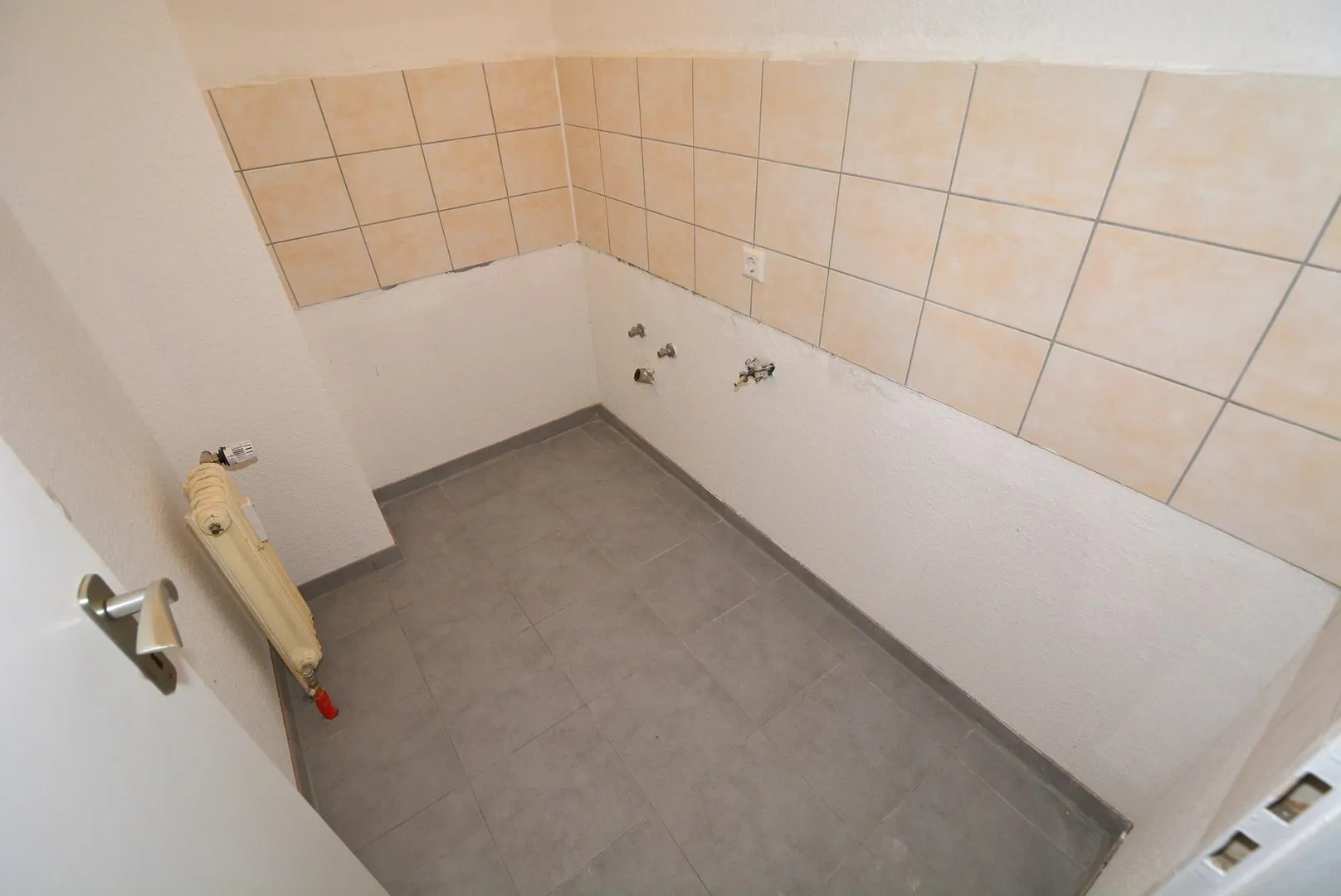 Die kleine Küche befindet sich zwischen Wohnzimmer und Bad. Sie verfügt aktuell über keine Küchenzeile.