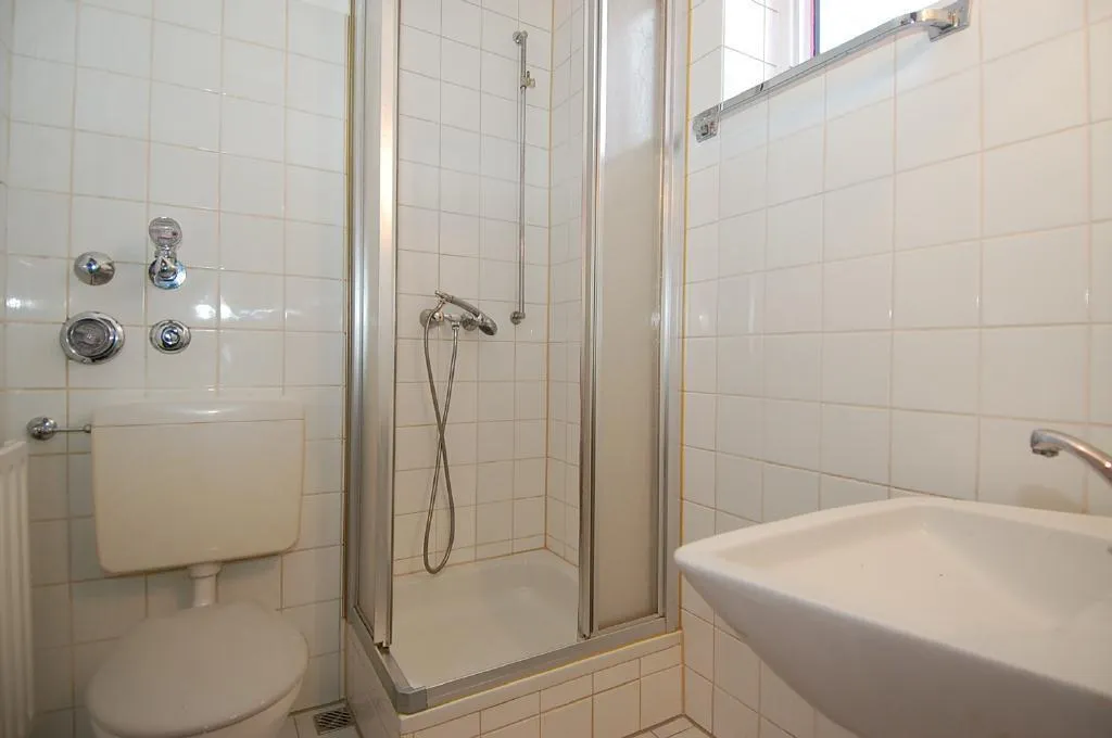 Das Bad ist halbhoch gefliest und mit Dusche, Waschbecken, WC und Fenster ausgestattet.