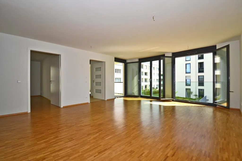Vom offenen Wohnzimmer und von der Küche ist der ca. 9 m² große und überdachte Süd-Balkon begehbar. Das Wohnzimmer verfügt zusätzlich über zwei französische Balkone.