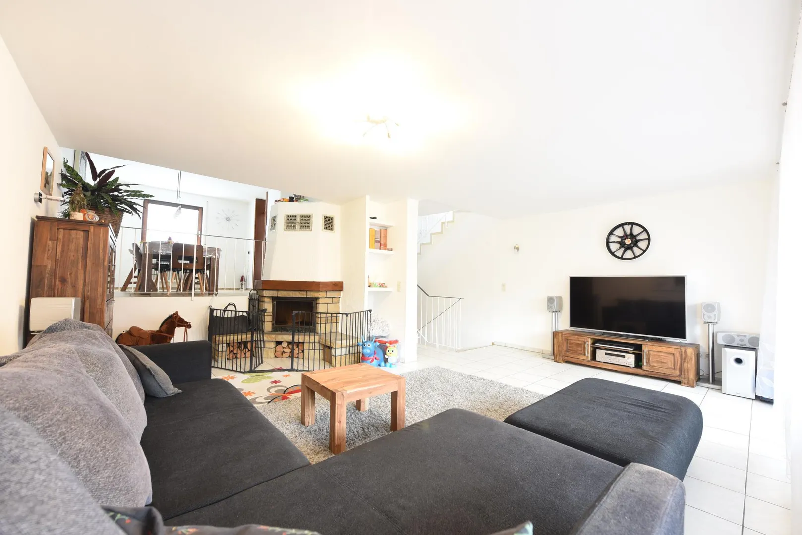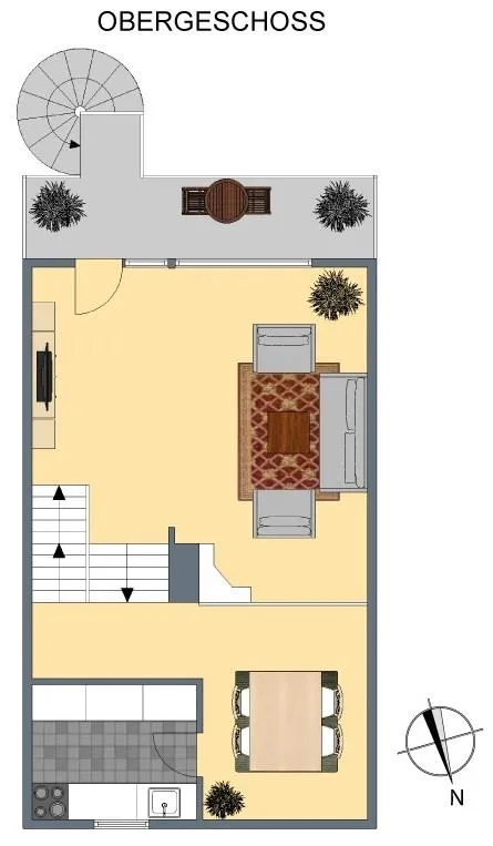 Im Obergeschoss befinden sich im unteren Bereich das offene Wohnzimmer mit Holzkamin und Balkon-Zugang sowie im oberen Bereich der offene Essbereich und die Küche. Die Küche ist mit einer Einbauküche ausgestattet. Der Garten ist über eine Wendeltreppe vom Balkon begehbar.