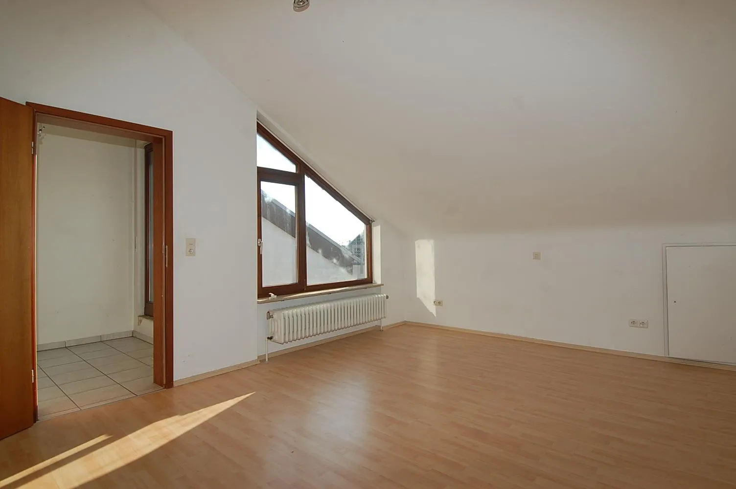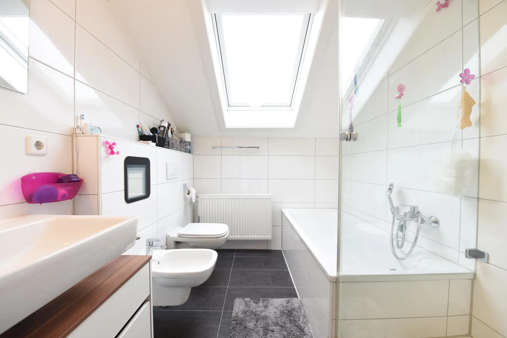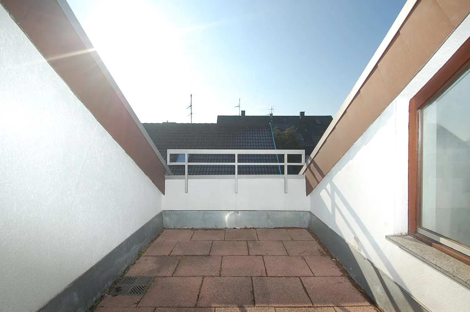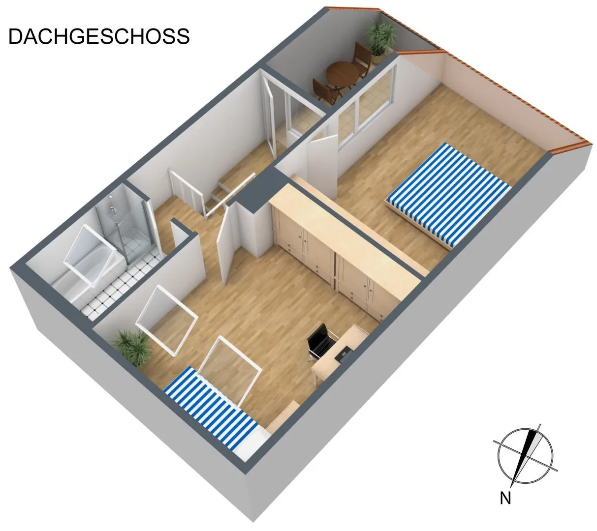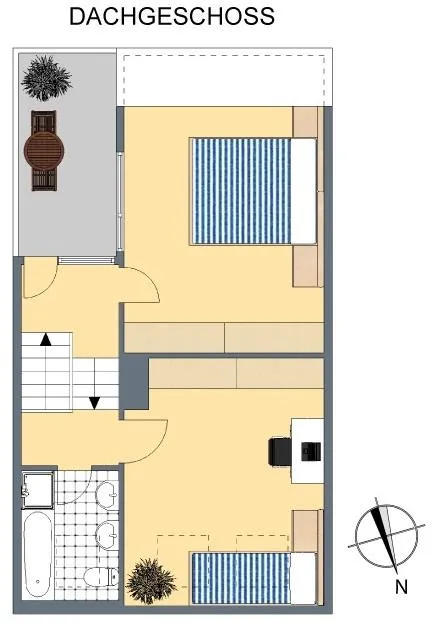 Im Dachgeschoss befinden sich im unteren Bereich ein Kinderzimmer und eine Dach-Terrasse sowie im oberen Bereich das Schlafzimmer sowie ein Tageslichtbad mit Wanne und Dusche.