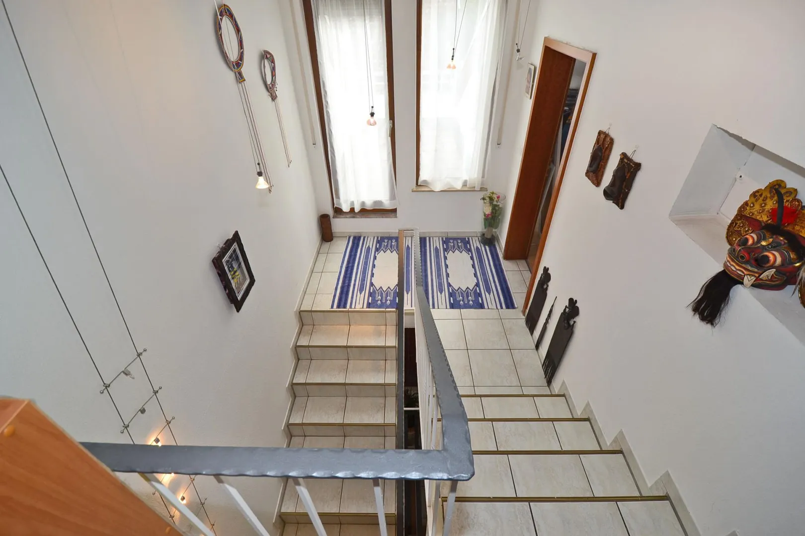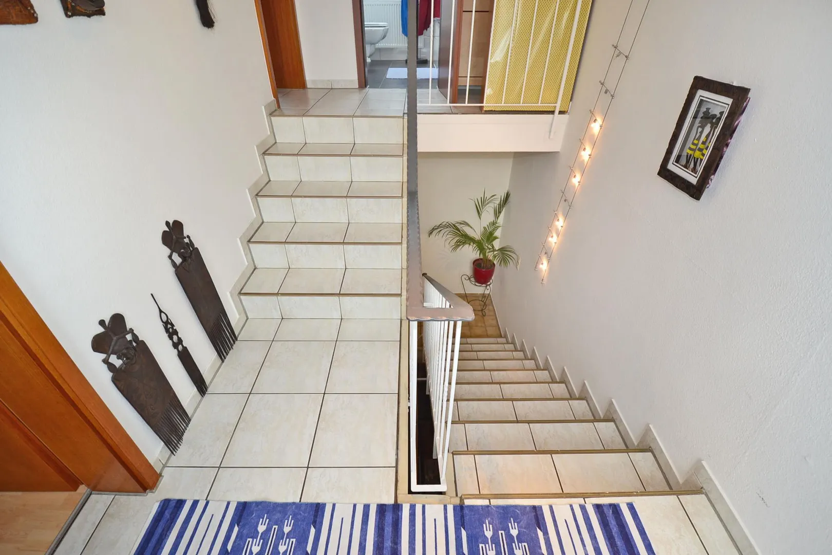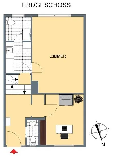 Im Eingangsbereich befinden sich eine Garderobe, ein Arbeitszimmer sowie ein separates WC. Auf der unteren Ebene befinden sich ein Kinderzimmer, ein Tageslichtbad mit Dusche sowie eine Diele.