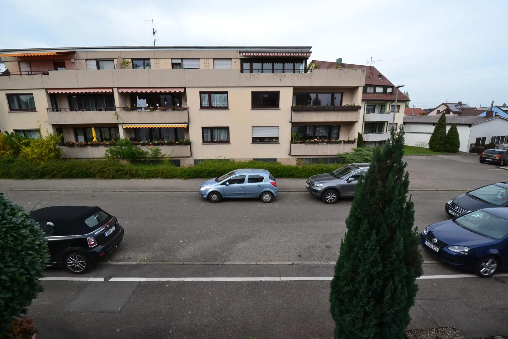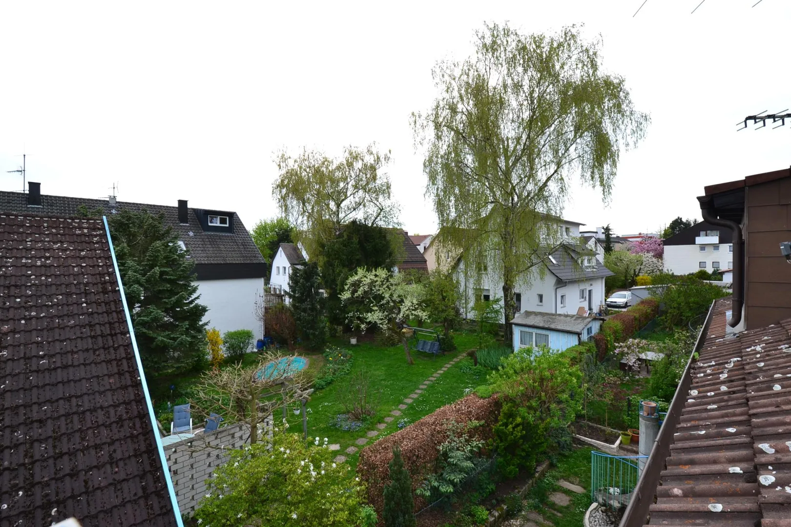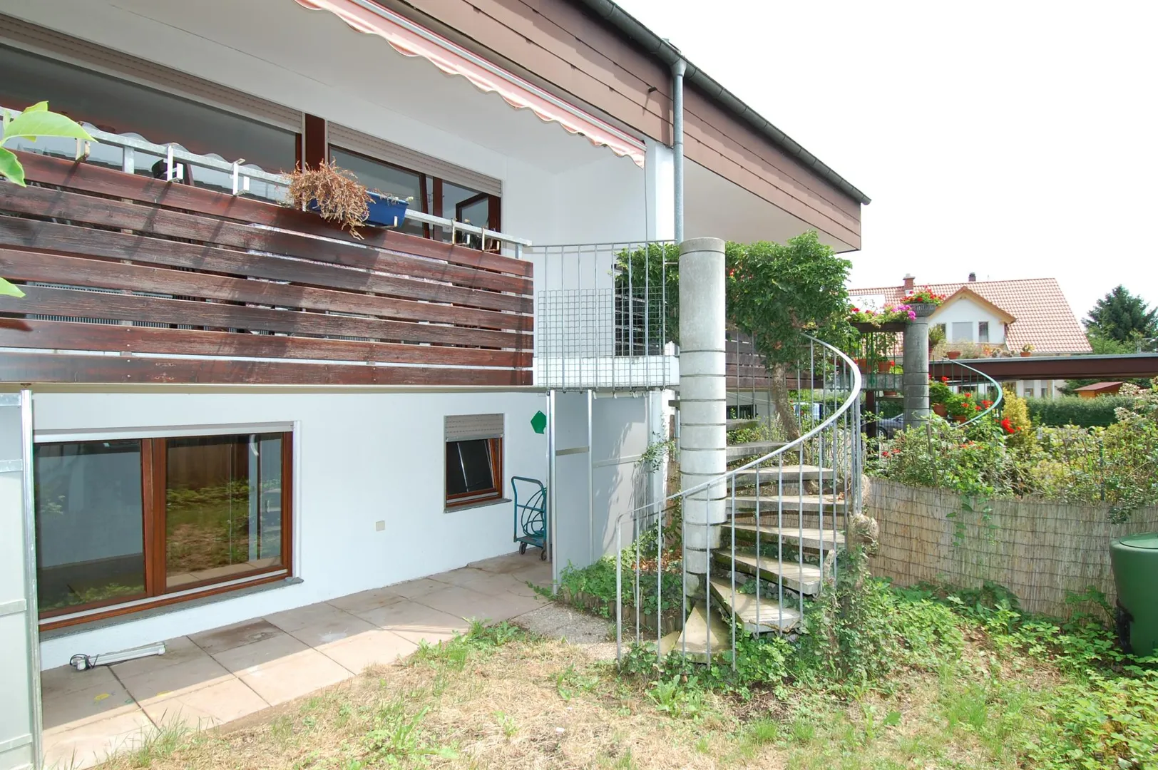 Das Grundstück ist eben und rechteckig. Das Haus mit den Balkonen, dem Wohnbereich und dem Garten ist nach Süden ausgerichtet.