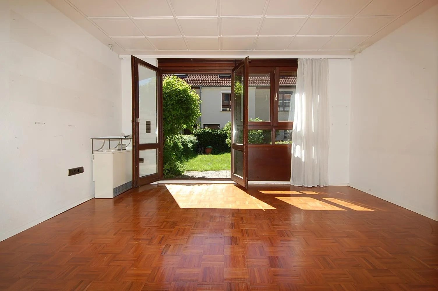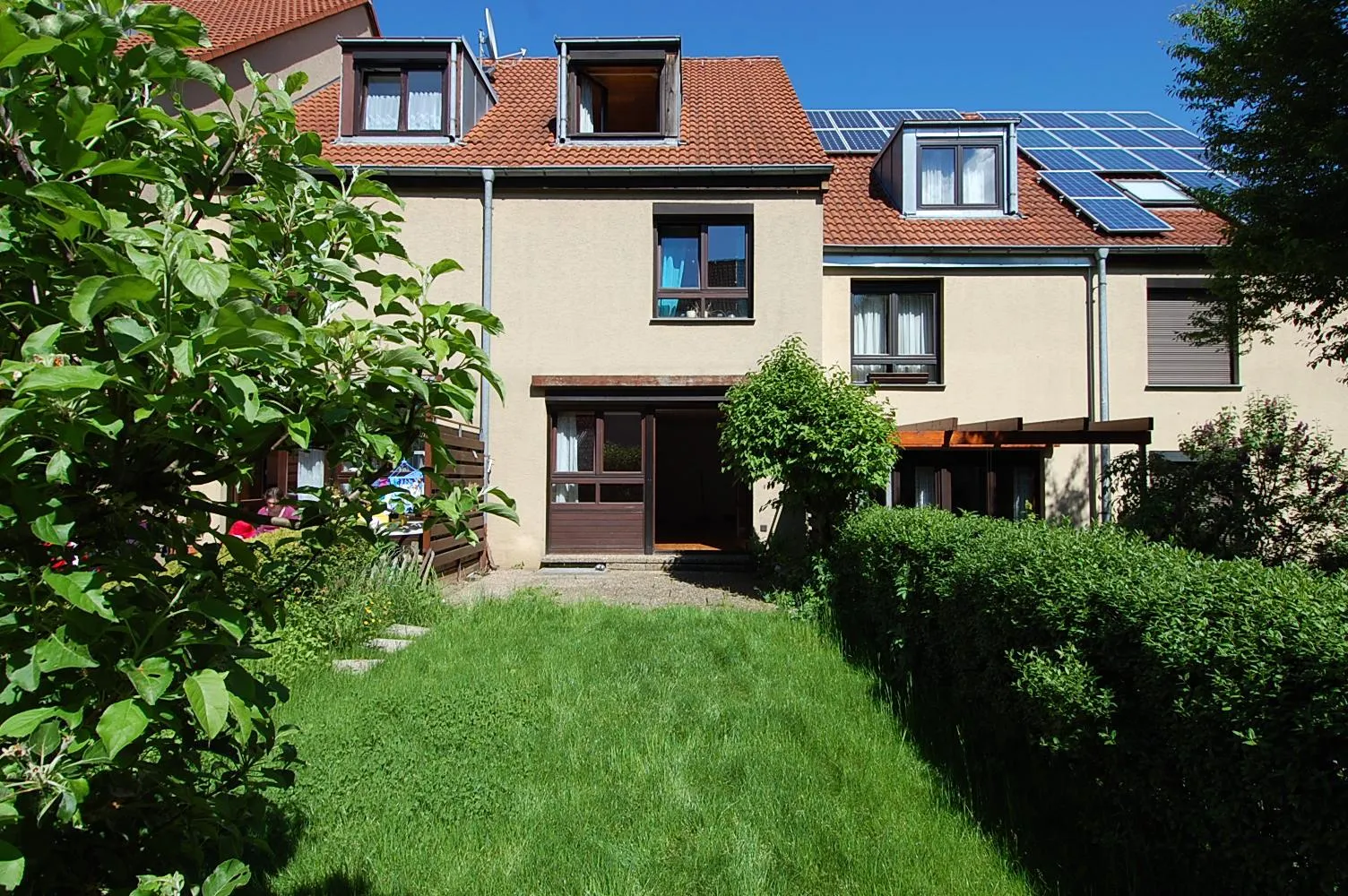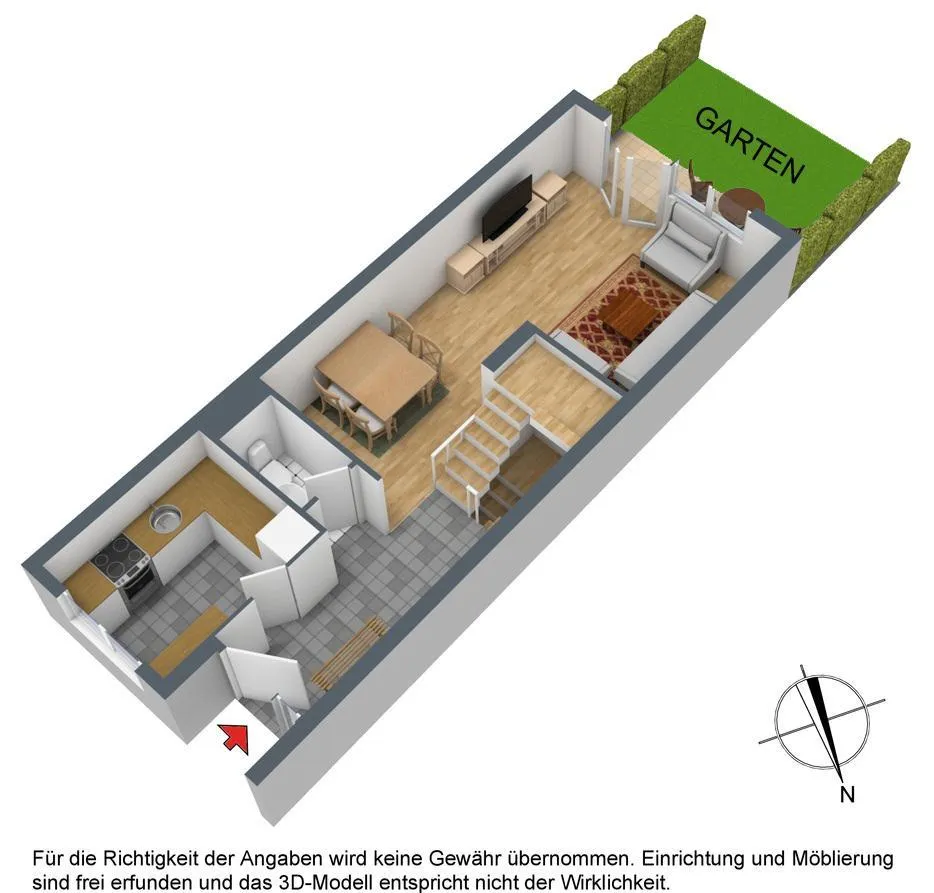 Im Erdgeschoss des Hauses befinden sich die Garderobe, die Küche, ein separates WC, der Wohn-Essbereich mit Zugang zur Terrasse und zum Garten.