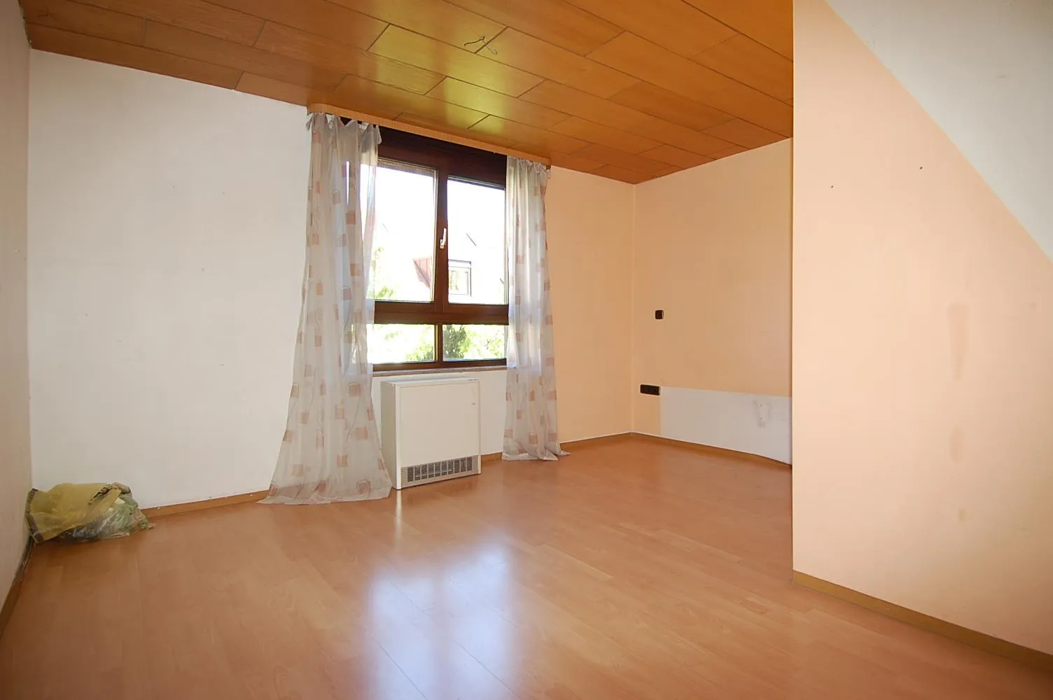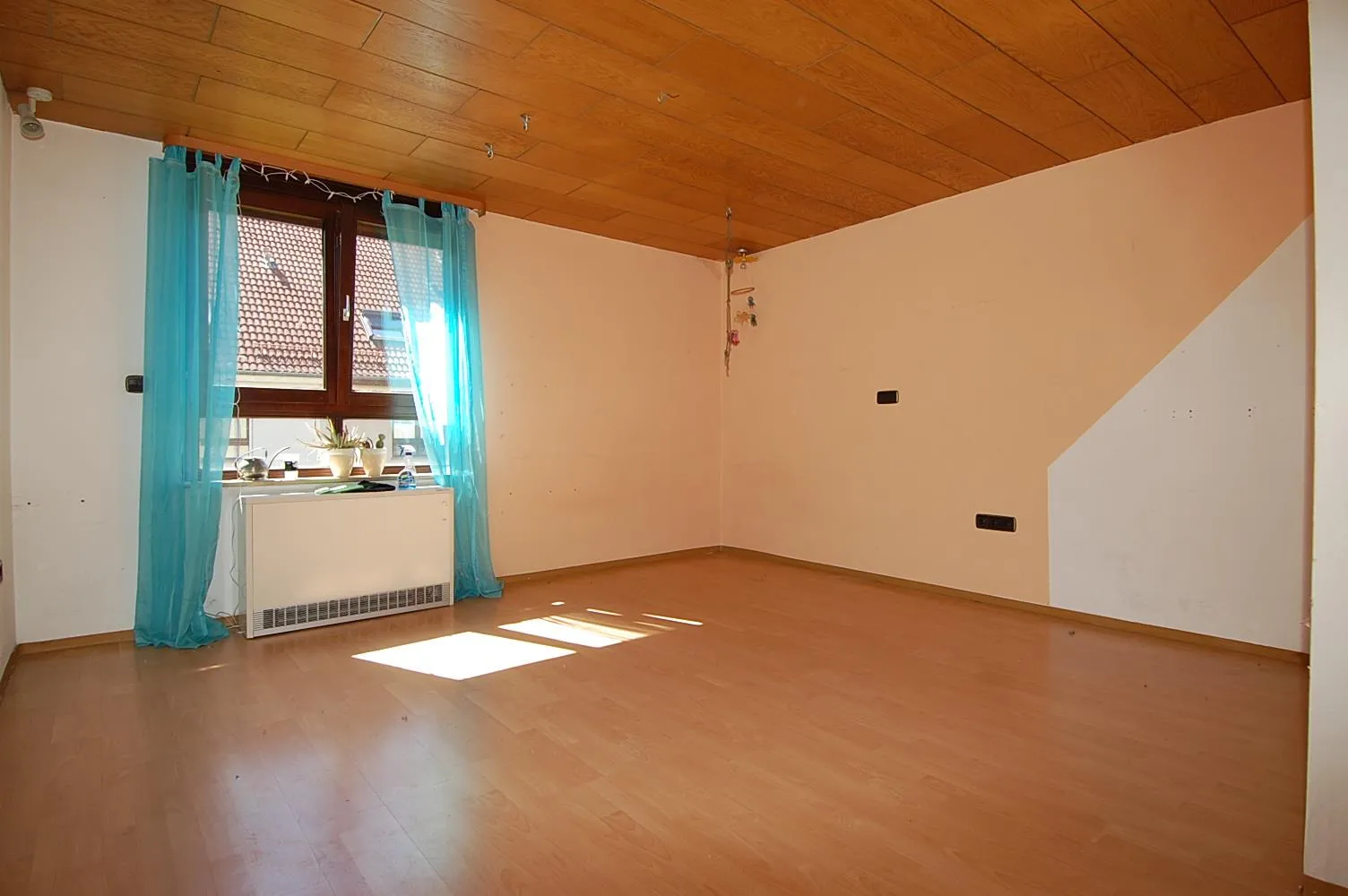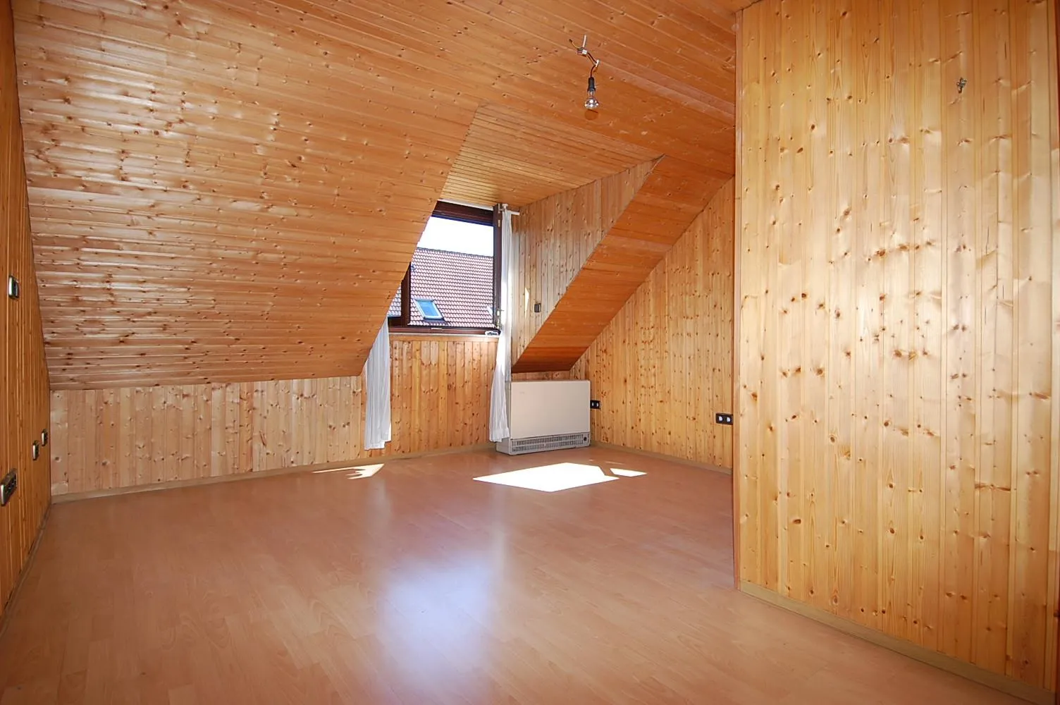 Im Dachgeschoss befinden sich 2 weitere Zimmer und ein weiteres Badezimmer. Die Zimmer sind mit Laminatböden ausgestattet. Die Decken und Wände sind mit Holzleisten verkleidet.