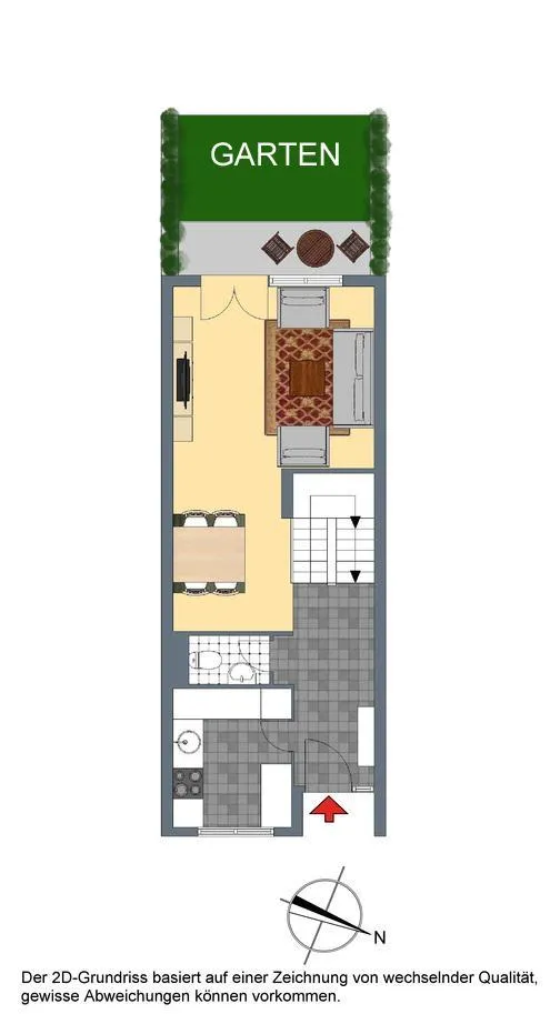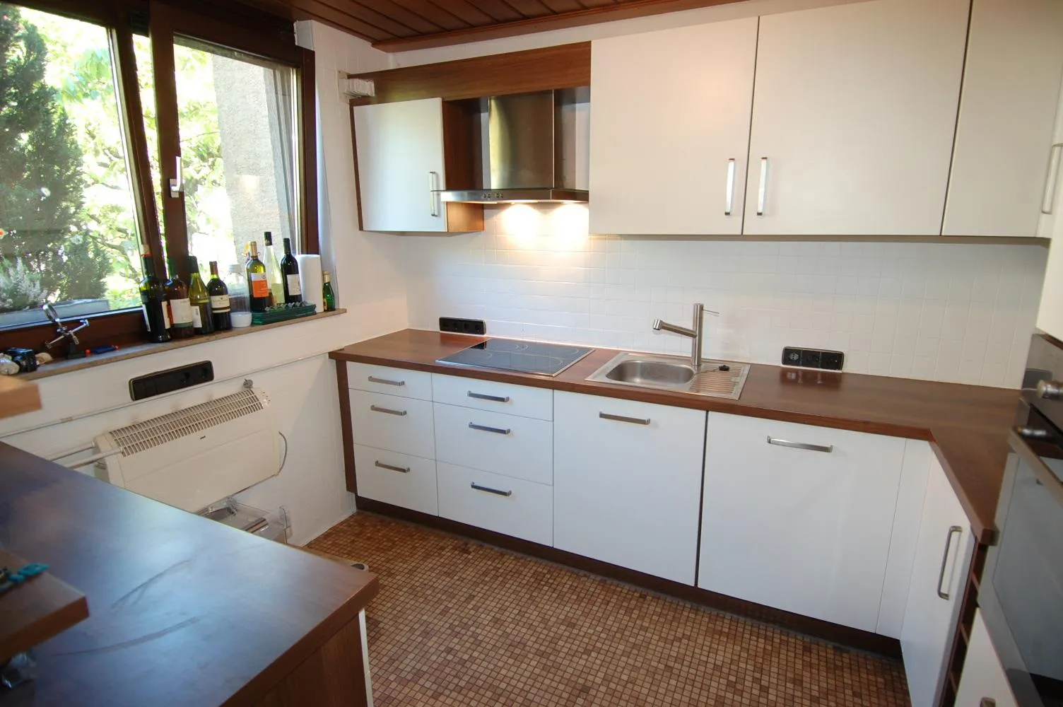 Im Erdgeschoss des Hauses befinden sich die Garderobe, die Küche, ein separates WC, der Wohn-Essbereich mit Zugang zur Terrasse und zum Garten.