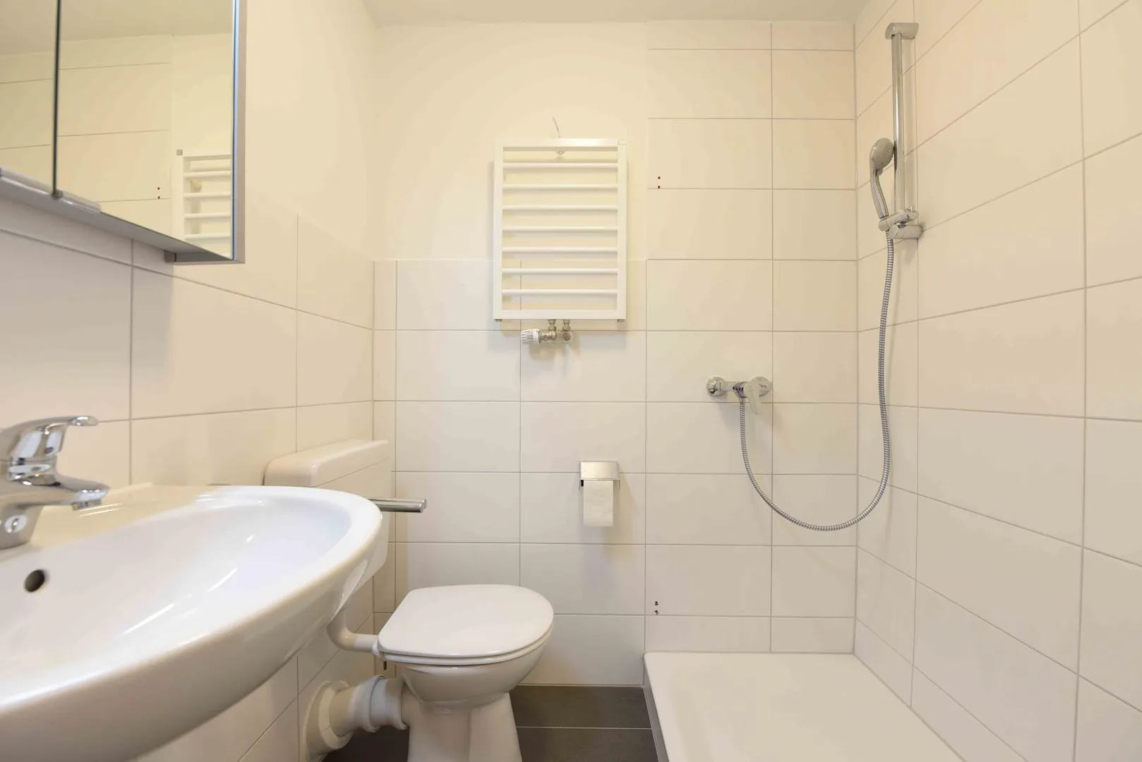 Das halbhoch geflieste Badezimmer ist mit einer Dusche, einem WC, einen Waschmaschinenanschluss sowie einem Spiegel ausgestattet.