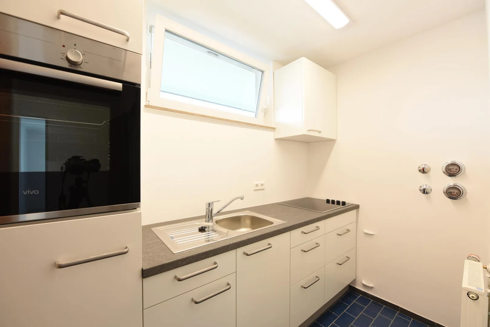 Die Küche verfügt über einen Fliesenboden sowie eine Einbauküche. Die Einbauküche beinhaltet einen Herd, einen Kühlschrank mit Gefrierfach, einen Backofen sowie Unter- und Oberschränke.