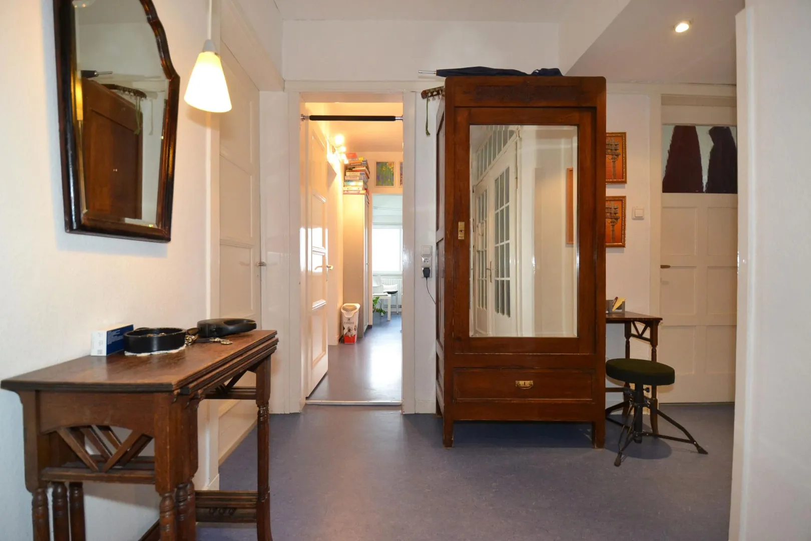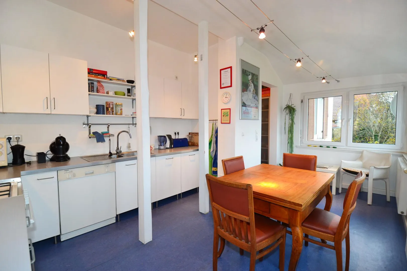 In der Diele und in der Küche ist blauer Linoleumboden verlegt.