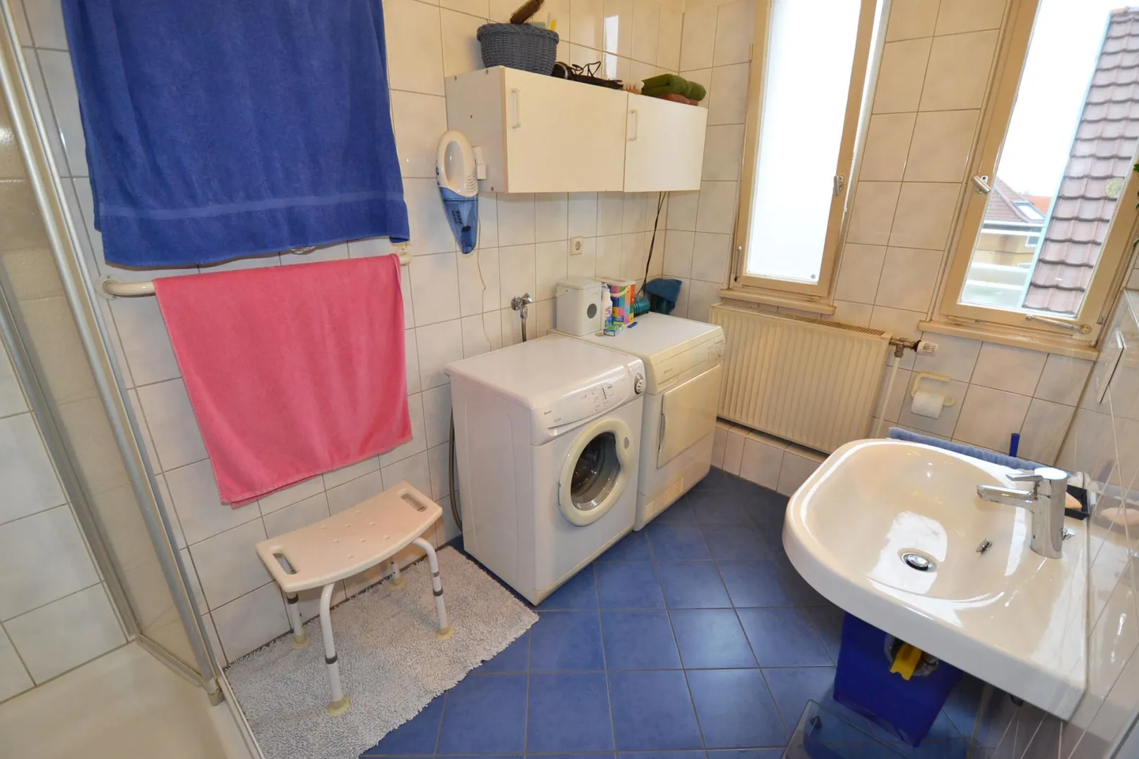 Das Bad ist mit blauem Fliesenboden, Dusche (neue Duschkabine), Waschbecken, WC, 2 Fenstern sowie Anschlüssen für Waschmaschine und Trockner ausgestattet. Die Wände sind hell gefliest.