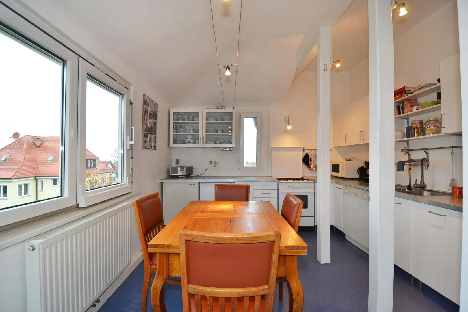 Die Küche ist nach Westen ausgerichtet und mit einer weißen Einbauküche von 2004 ausgestattet.