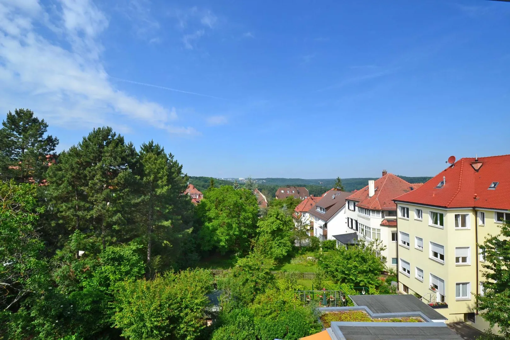 Von der Küche aus haben Sie einen weiten Fernblick über begrünte Grundstücke bis zu den Wäldern um den Waldfriedhof und über Kaltental bis nach Vaihingen.