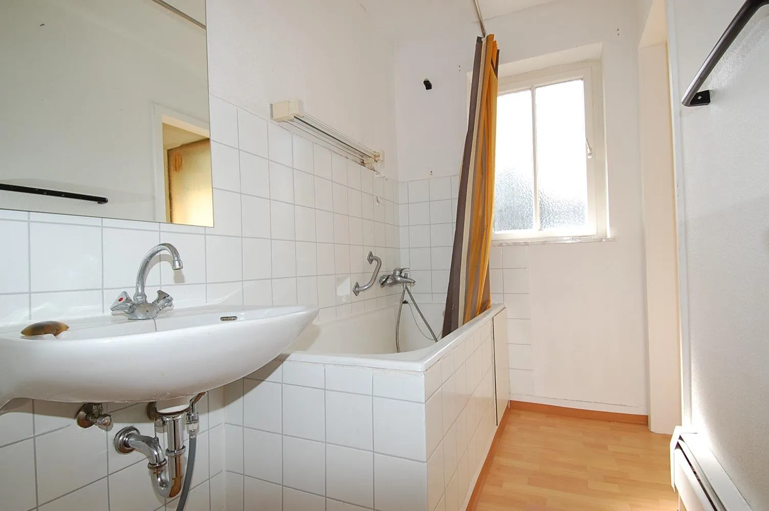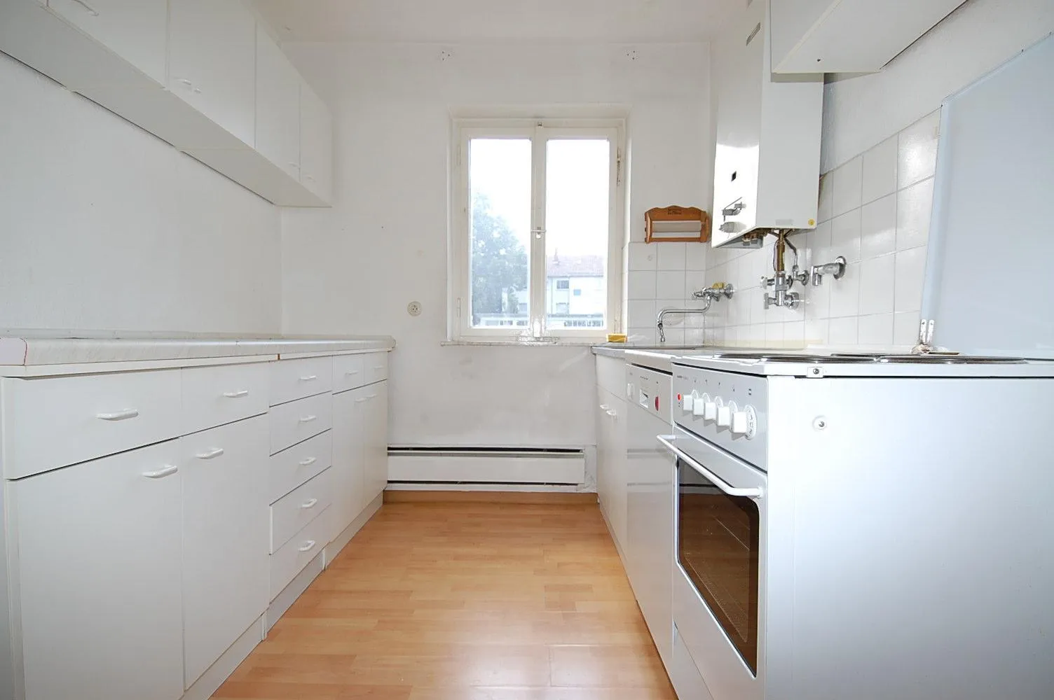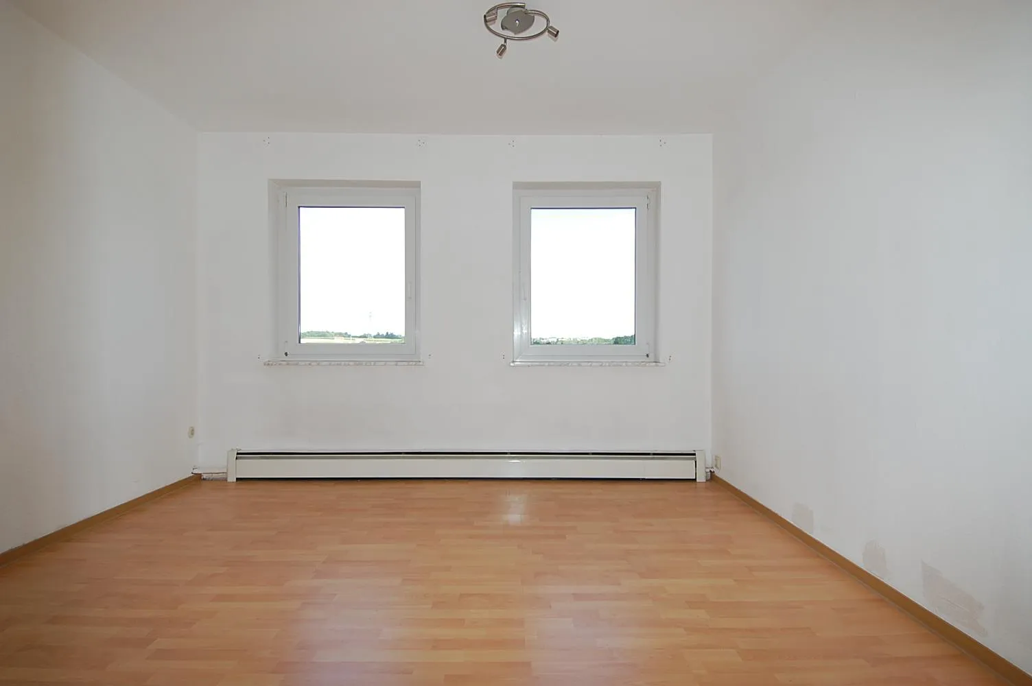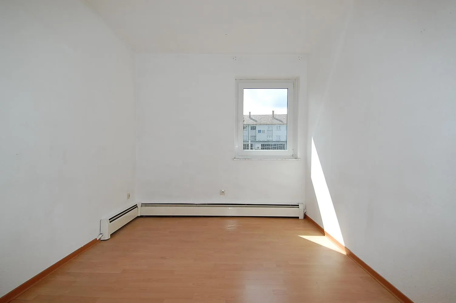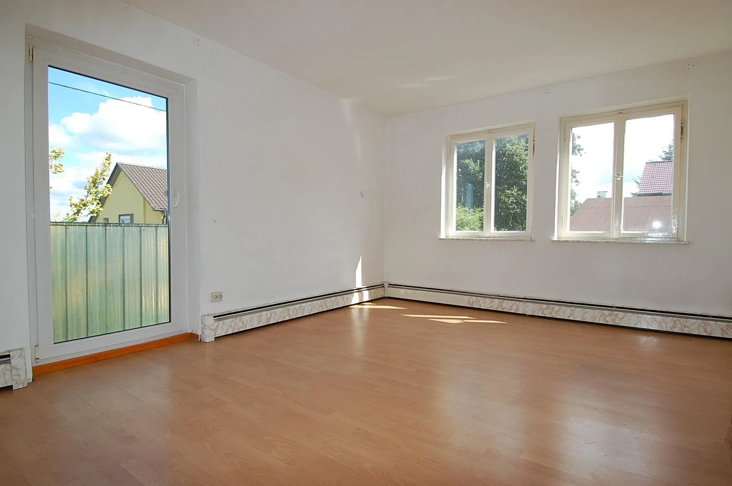 Alle Räume sind mit einem hellen Laminatbodenbelag ausgestattet, der jedoch teileweise quietscht. Am Wohnzimmer befindet sich ein französischer Balkon.