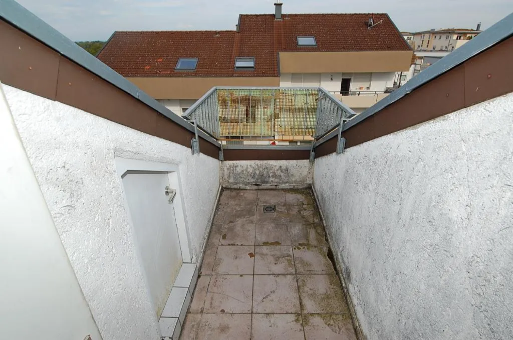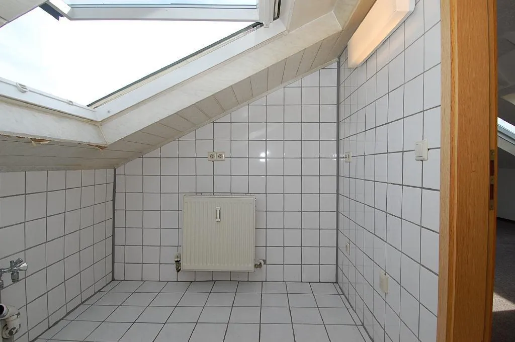 Der Grundriss der Wohnung ist gut. Die Zimmer, die Küche und das Badezimmer sind vom Flur aus begehbar. Der Zugang zur kleineren Ost-Dachterrasse befindet sich direkt neben der Wohnung.