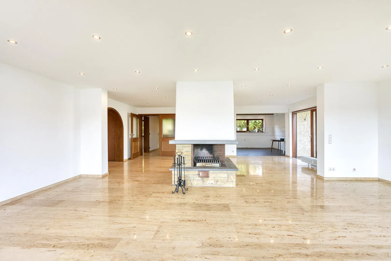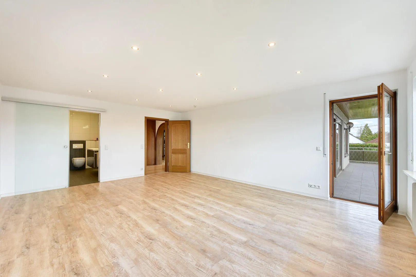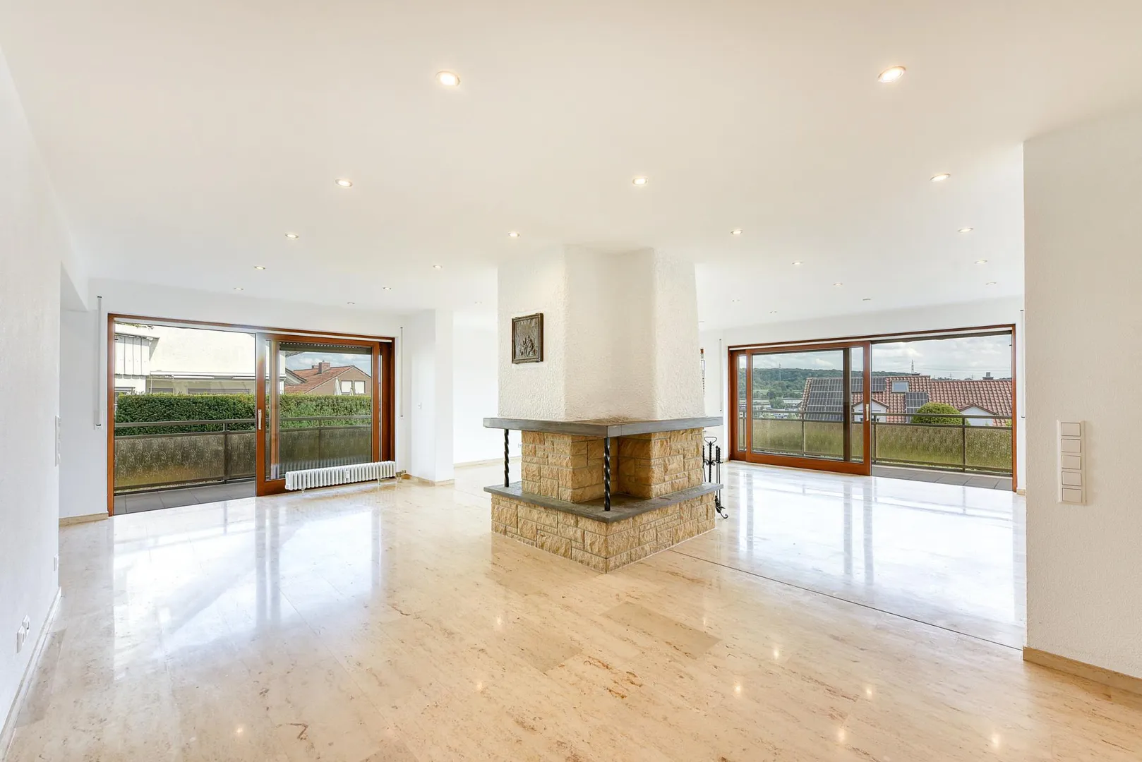 Der Grundriss ist extravagant: inmitten des riesigen Wohnbereichs mit ca. 57 m² Größe, befindet sich der offene Holzkamin. Der überdachte Balkon umläuft den Wohnbereich von der Ost- und Südseite. Das Arbeitszimmer ist separat und befindet sich direkt neben der Wohnung. Über einen Zwischen-Flur, indem sich das separate WC befindet geht es ins Schlafzimmer und von dort, über eine Schiebetür, ins Badezimmer. Die Küche ist zum Wohnbereich offen. Der Zugang zum Balkon ist vom Wohnbereich über zwei Seiten und vom Schlafzimmer. Das separate WC sowie das Badezimmer sind innenliegend.