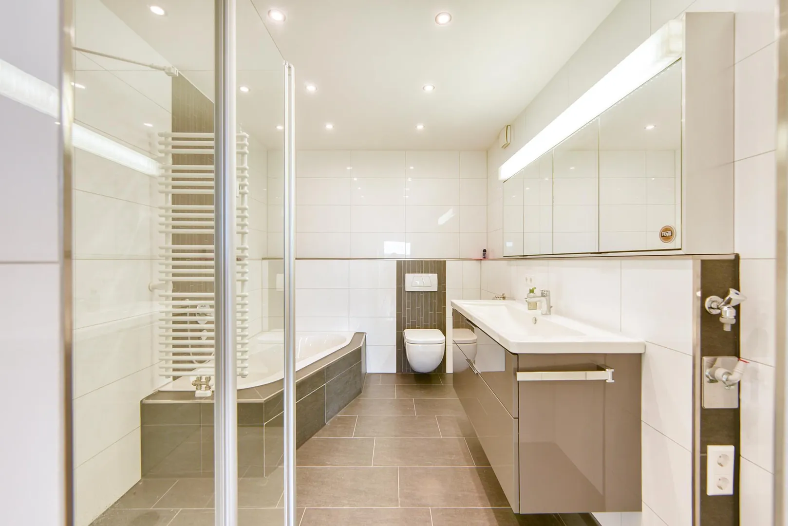 Das raumhoch geflieste Badezimmer ist ausgestattet mit einer Badewanne, einer bodentiefen Dusche, einem WC, einem breiten Waschbecken, einem Handtuch-Heizkörper, einem belichteten Spiegelschrank, einem Waschtisch-Unterschrank sowie Decken-Spots.
