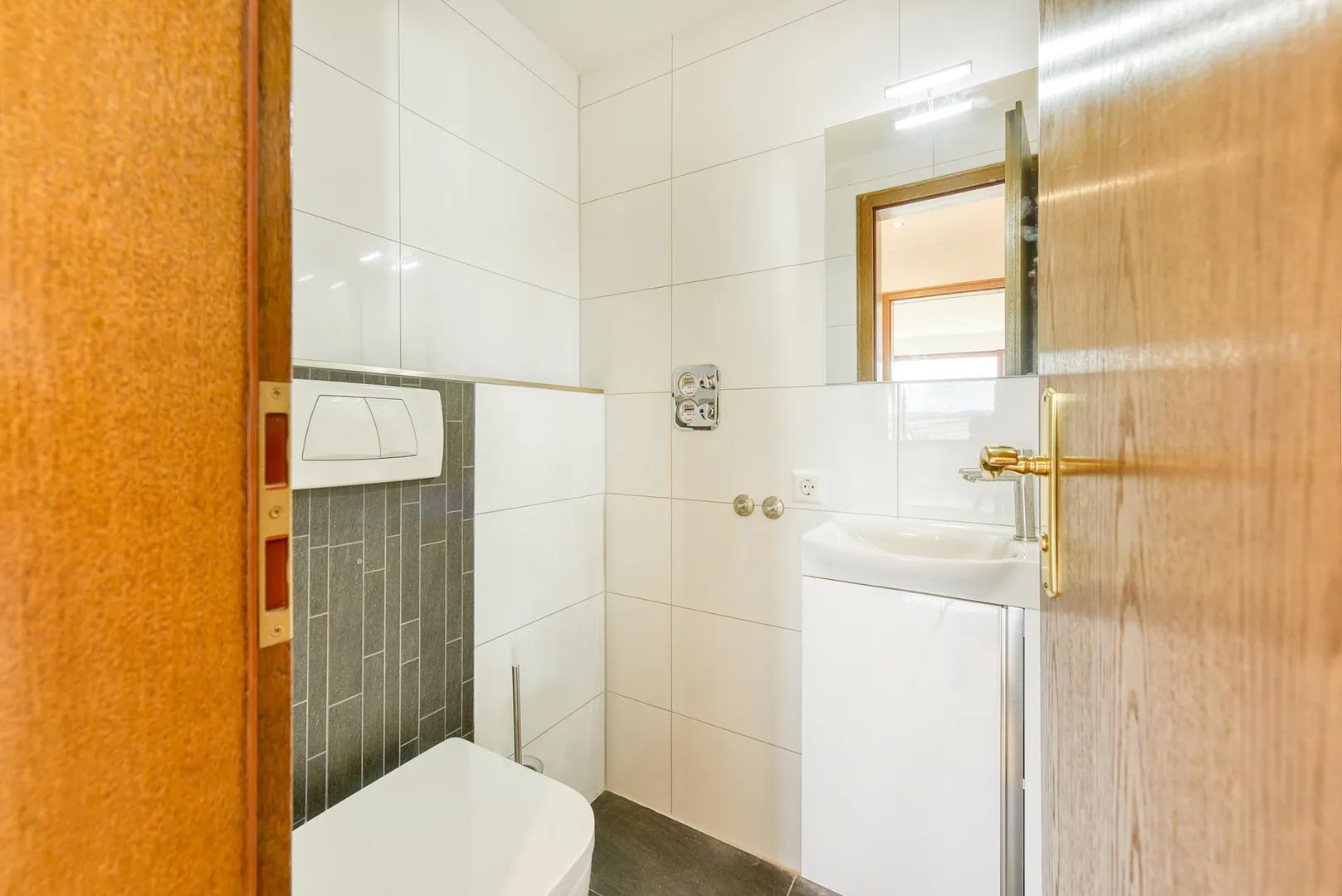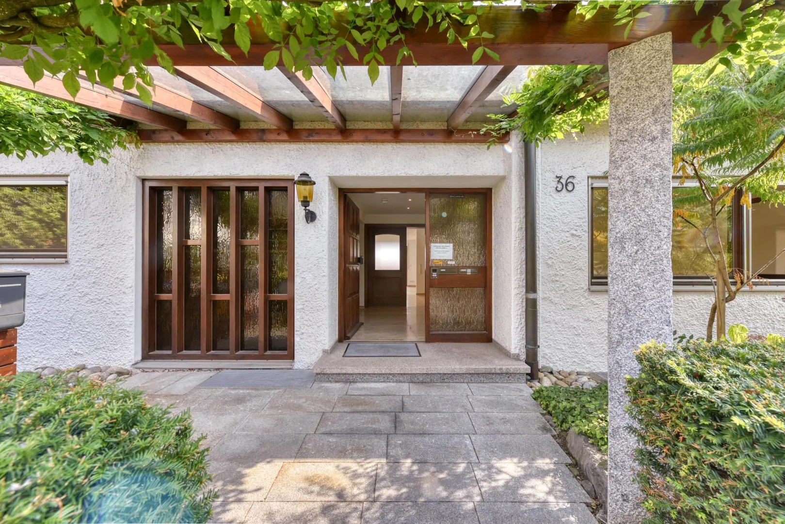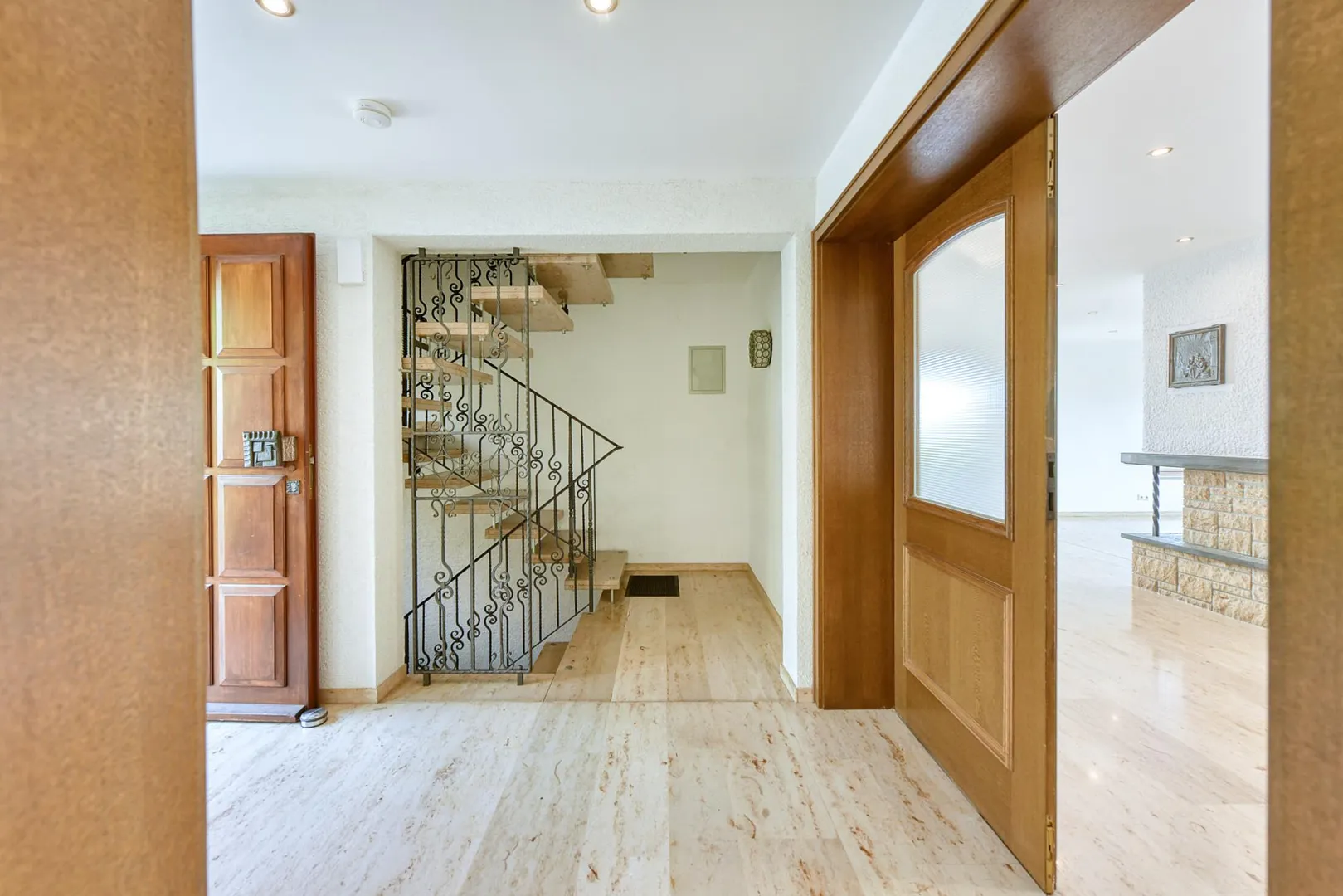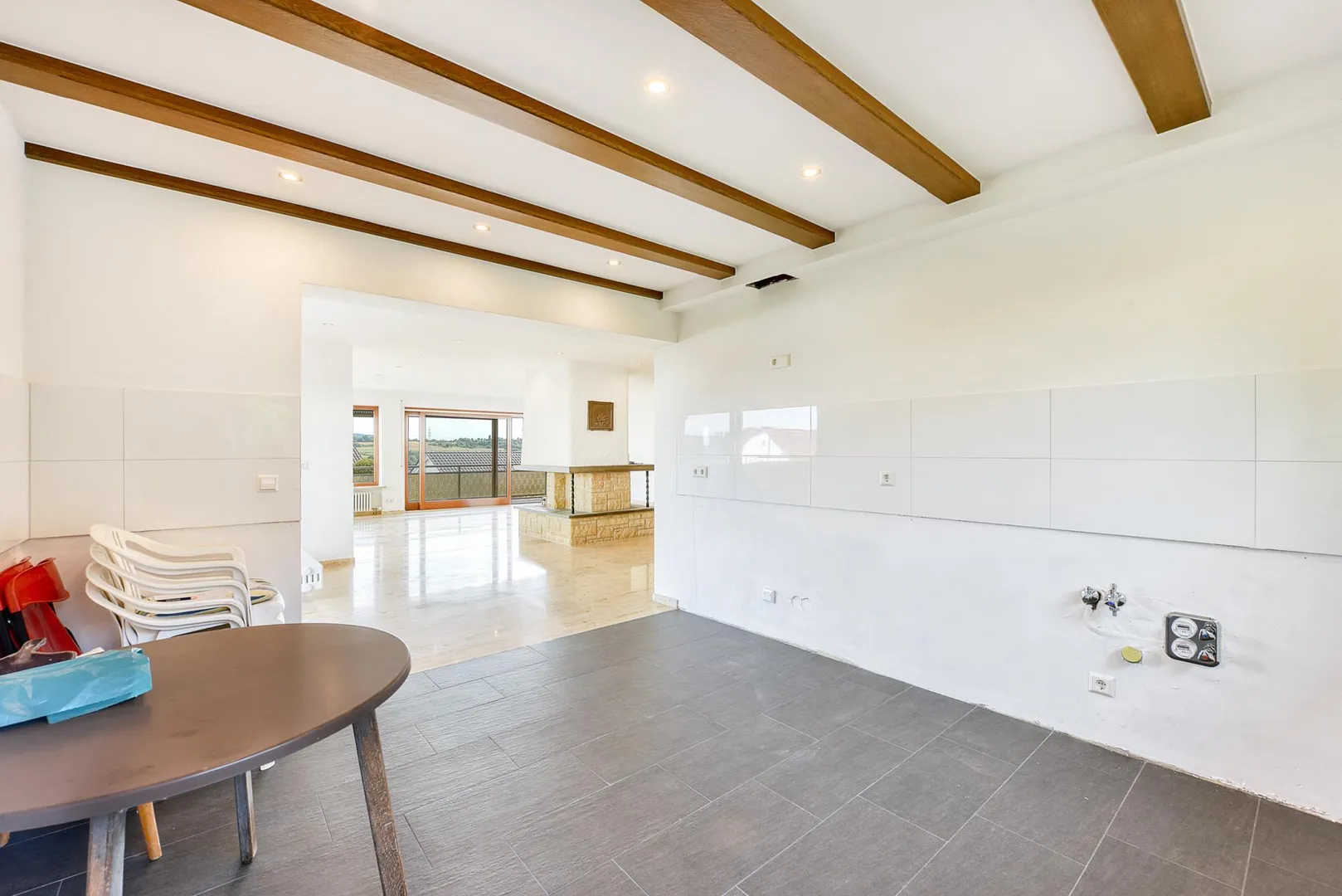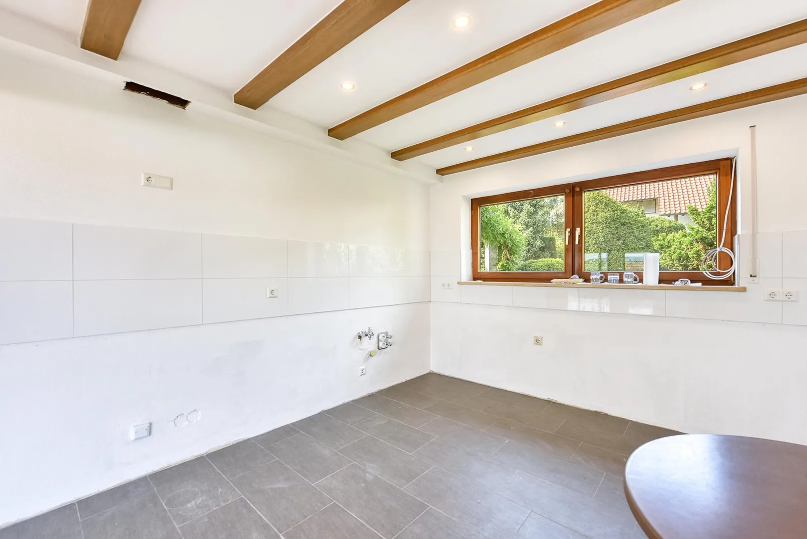 Die Wände sind überwiegend verputzt und frisch, weiß gestrichen.