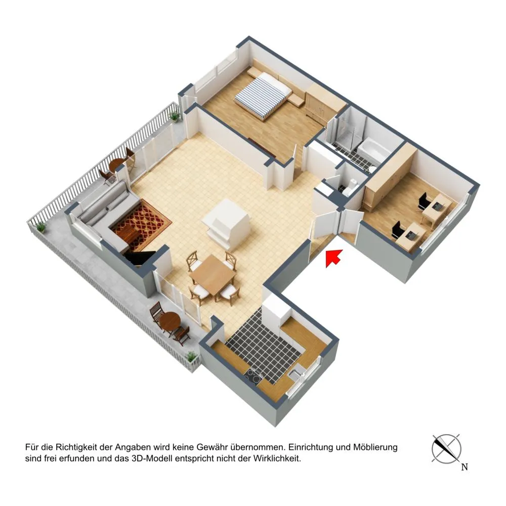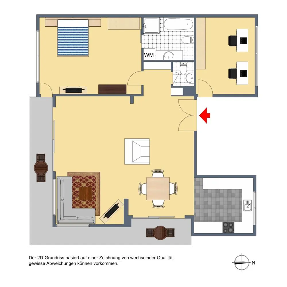 Die Küche sowie das Arbeitszimmer sind nach Norden ausgerichtet. Der Wohnbereich ist nach Osten und Süden ausgerichtet. Das Schlafzimmer ist nach Süden ausgerichtet.