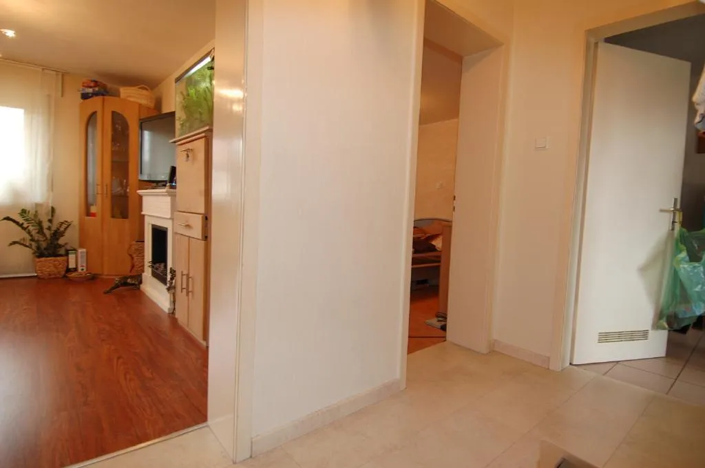 Das Wohnzimmer und der Flur sind mit Laminat ausgestattet. Im Schlafzimmer liegt ein Teppich. Der Küchenboden ist gefliest.